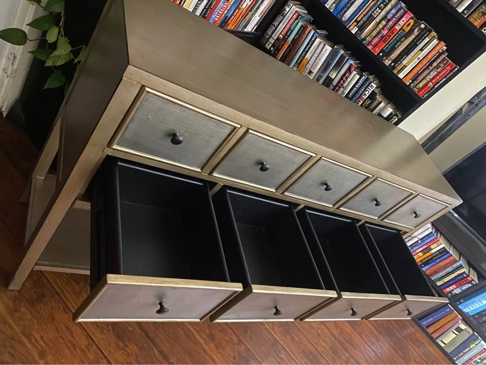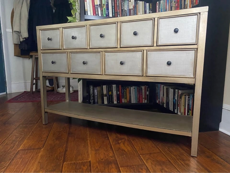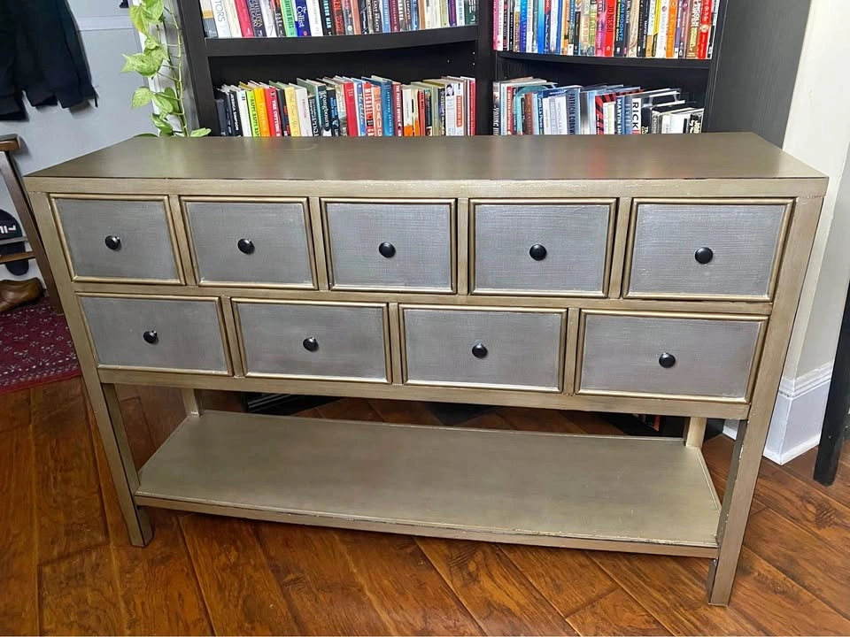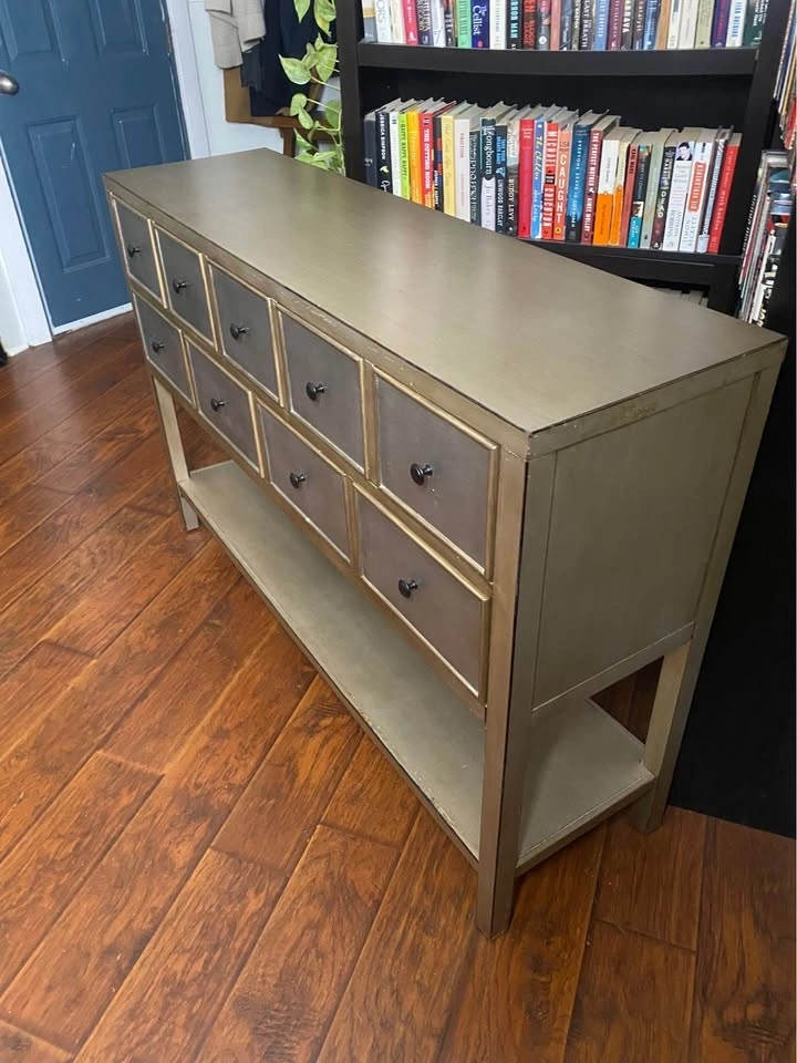 Elegant 9-drawer console table with a beautiful metallic champagne-bronze finish and textured drawer fronts.