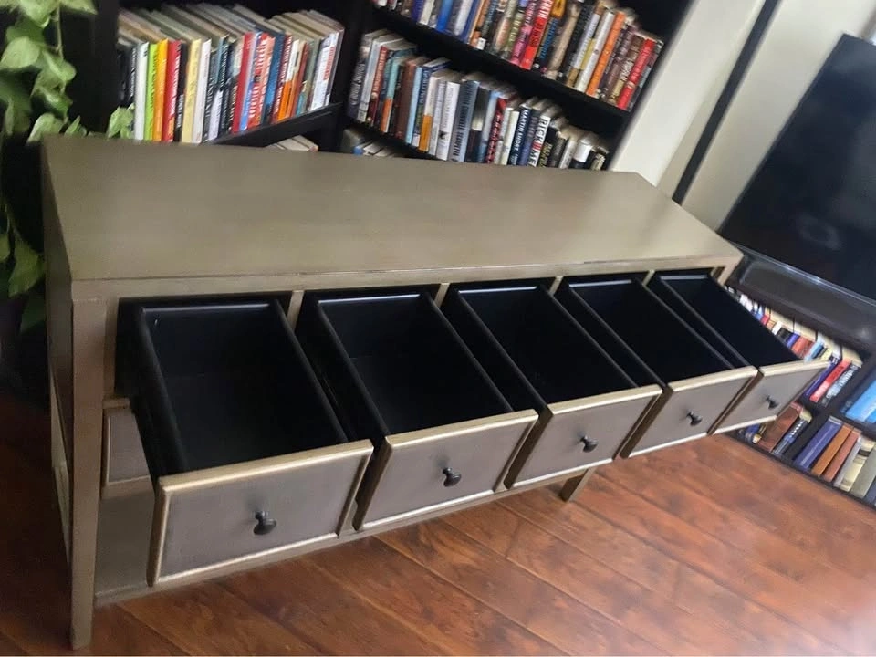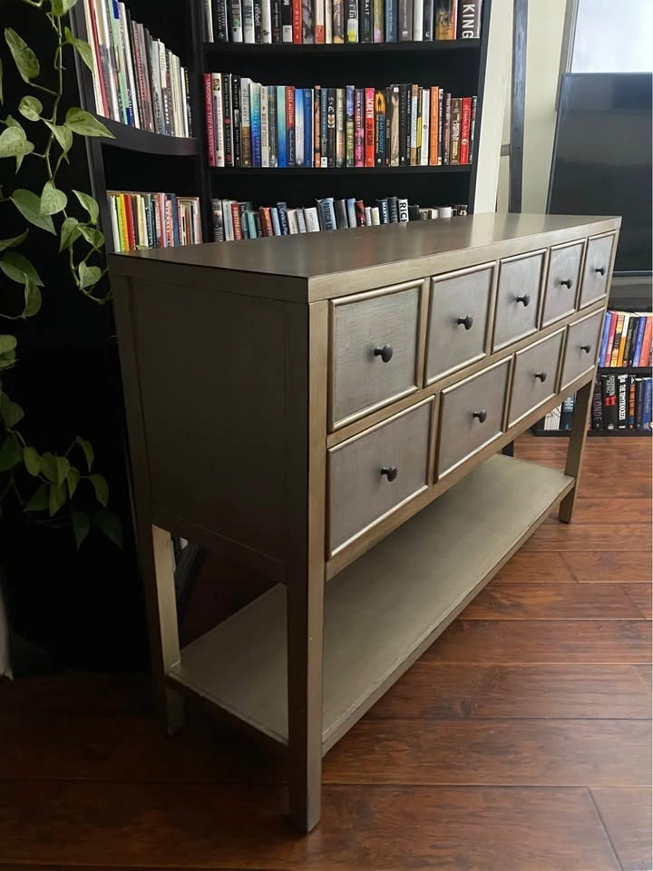 Elegant 9-drawer console table with a beautiful metallic champagne-bronze finish and textured drawer fronts.