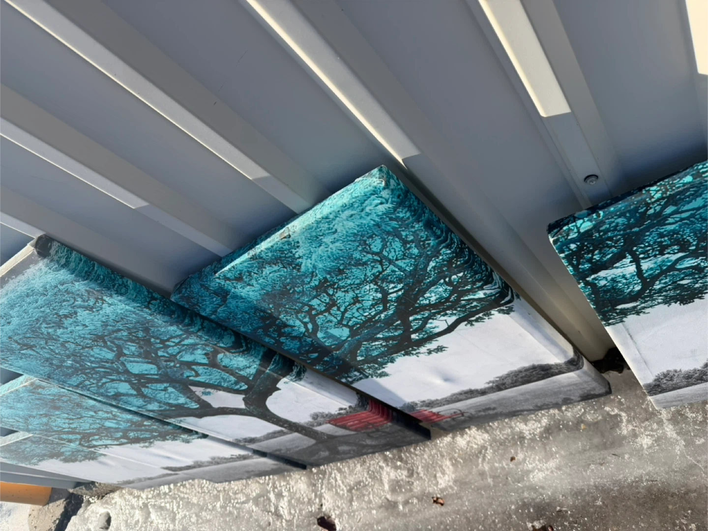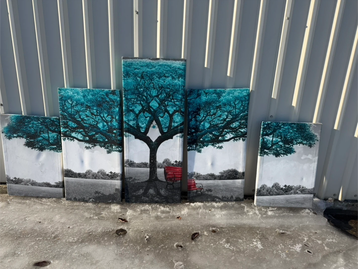 A set of five canvas pieces featuring a striking teal tree with a red bench. It's a modern art print that adds a pop of colour. This art set is perfect for your living room or hallway!