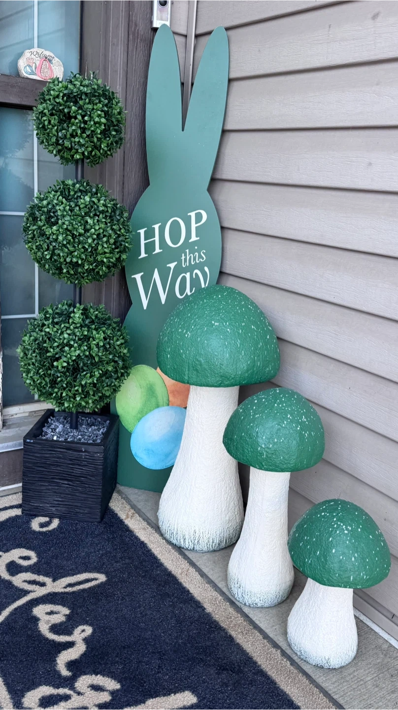 Set of three whimsical mushrooms Perfect for welcoming guests this Easter season. The mushrooms feature white stems and green speckled caps, adding a playful touch to your outdoor decor.