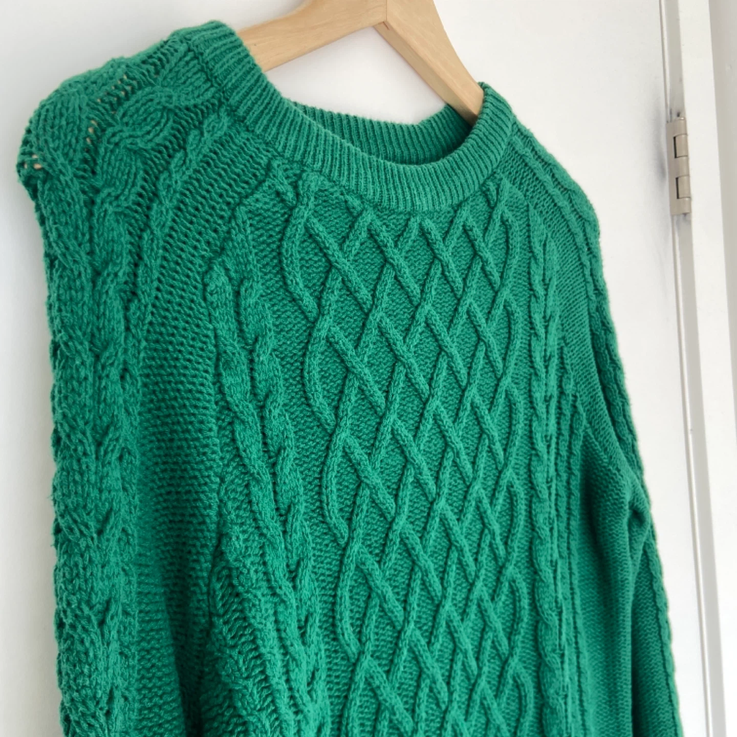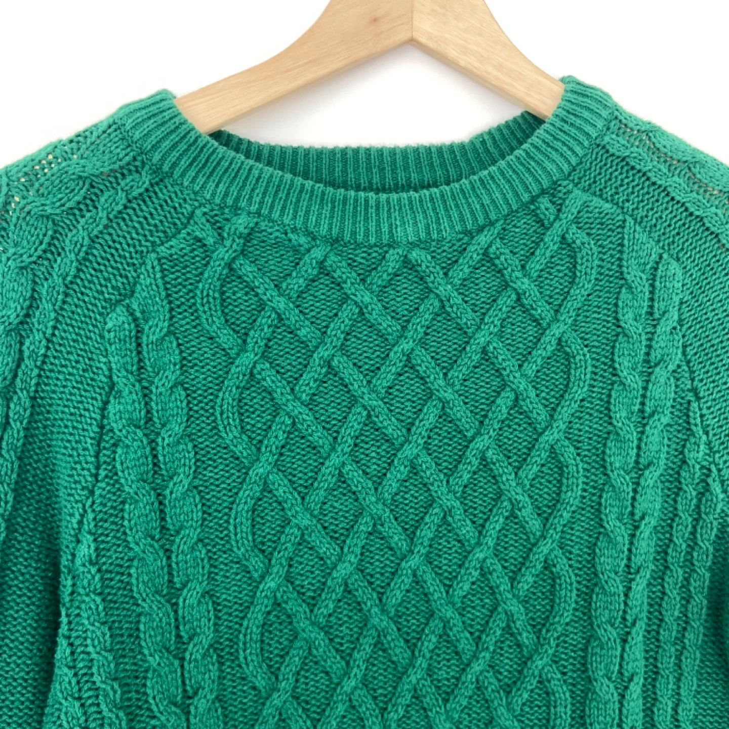 A lovely cozy green cotton blend cable knit sweater for women. It features a classic crew neck and long sleeves with braided cable patterns. Great for layering on cooler days!