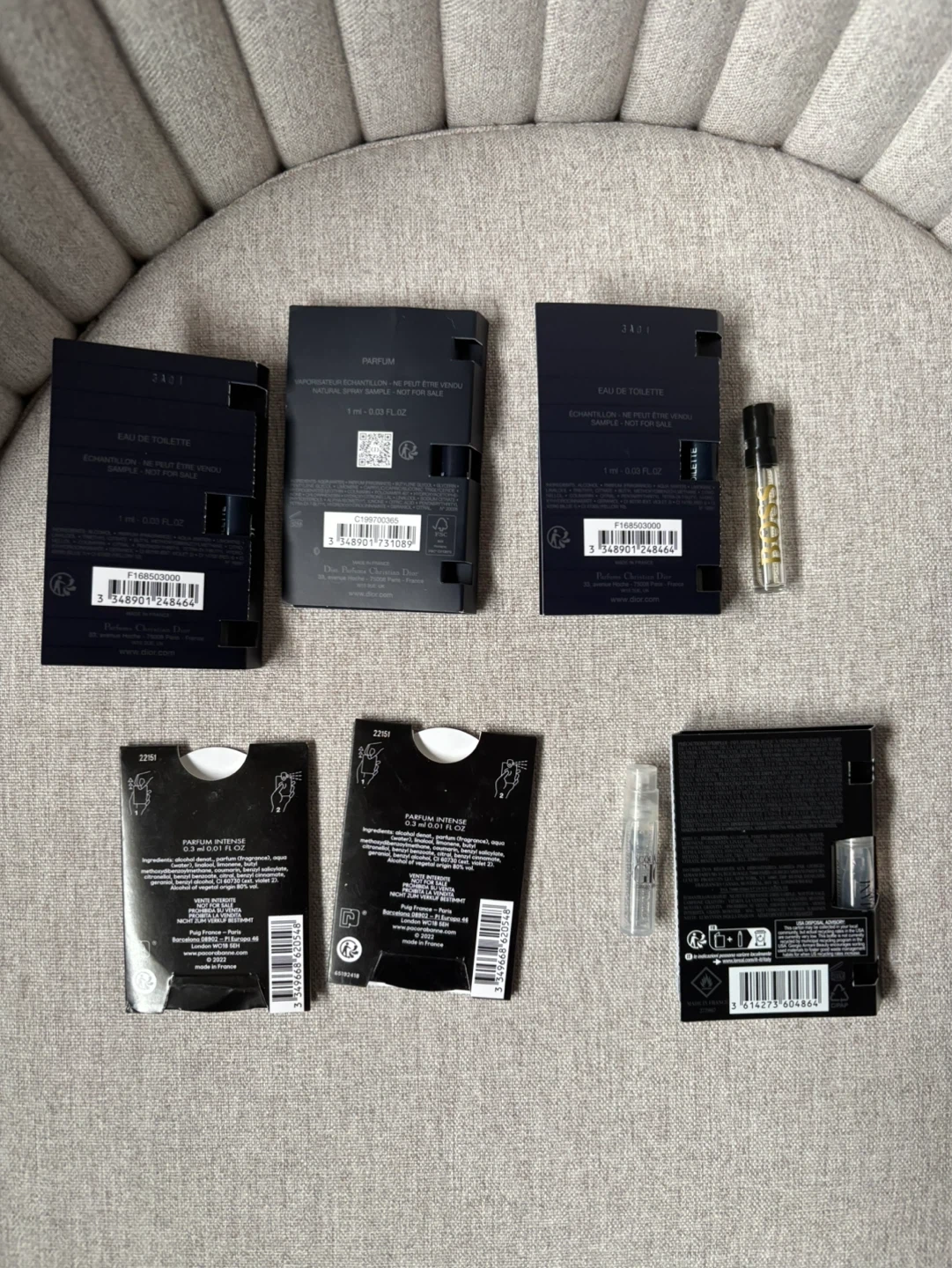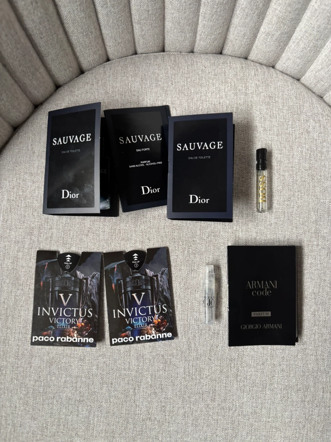 Includes four Dior Sauvage samples (Eau de Toilette and Eau Forte), two Paco Rabanne Invictus Victory Elixir samples, and one Giorgio Armani Code Parfum sample. Also includes two additional small fragrance vials.