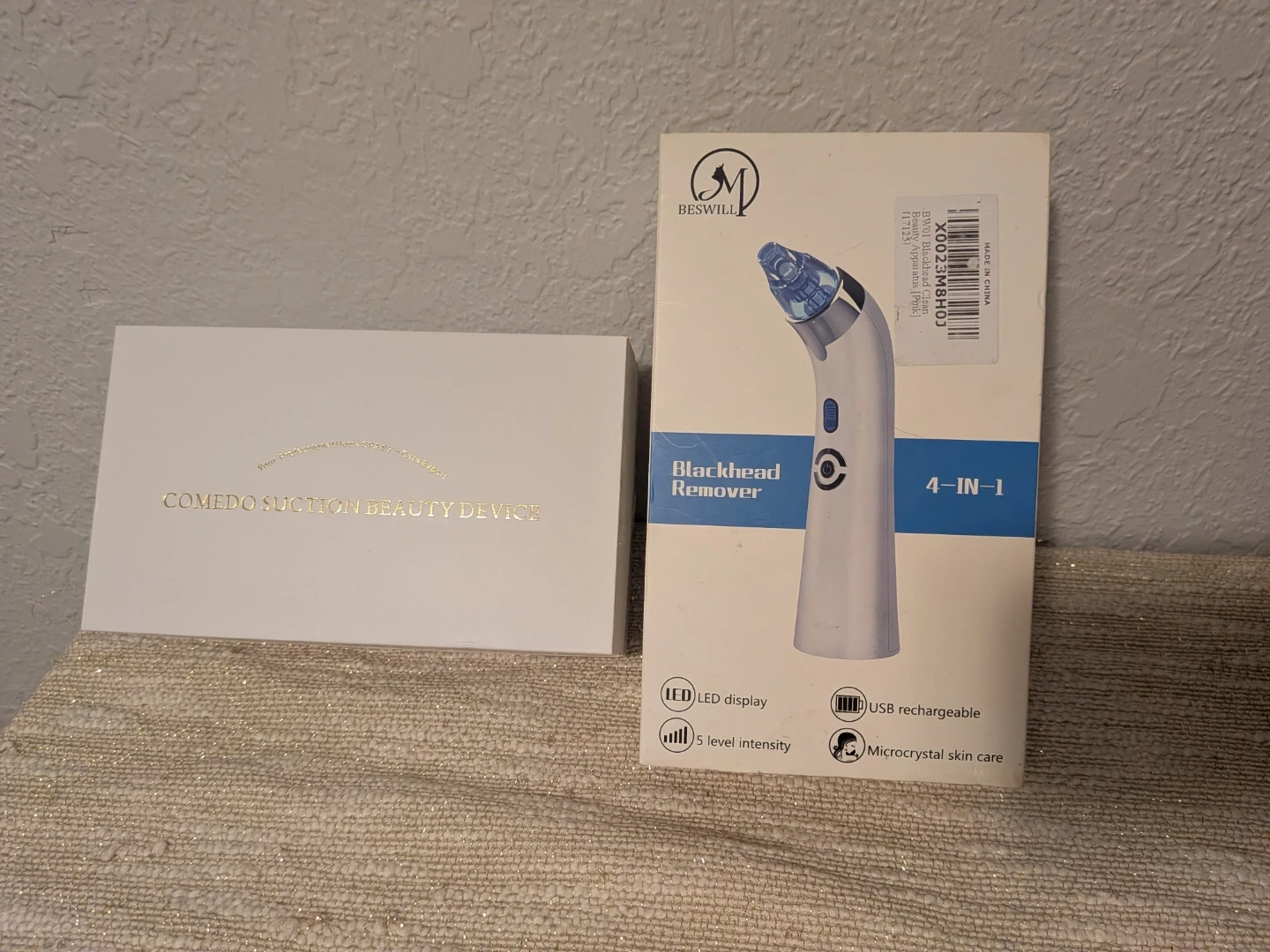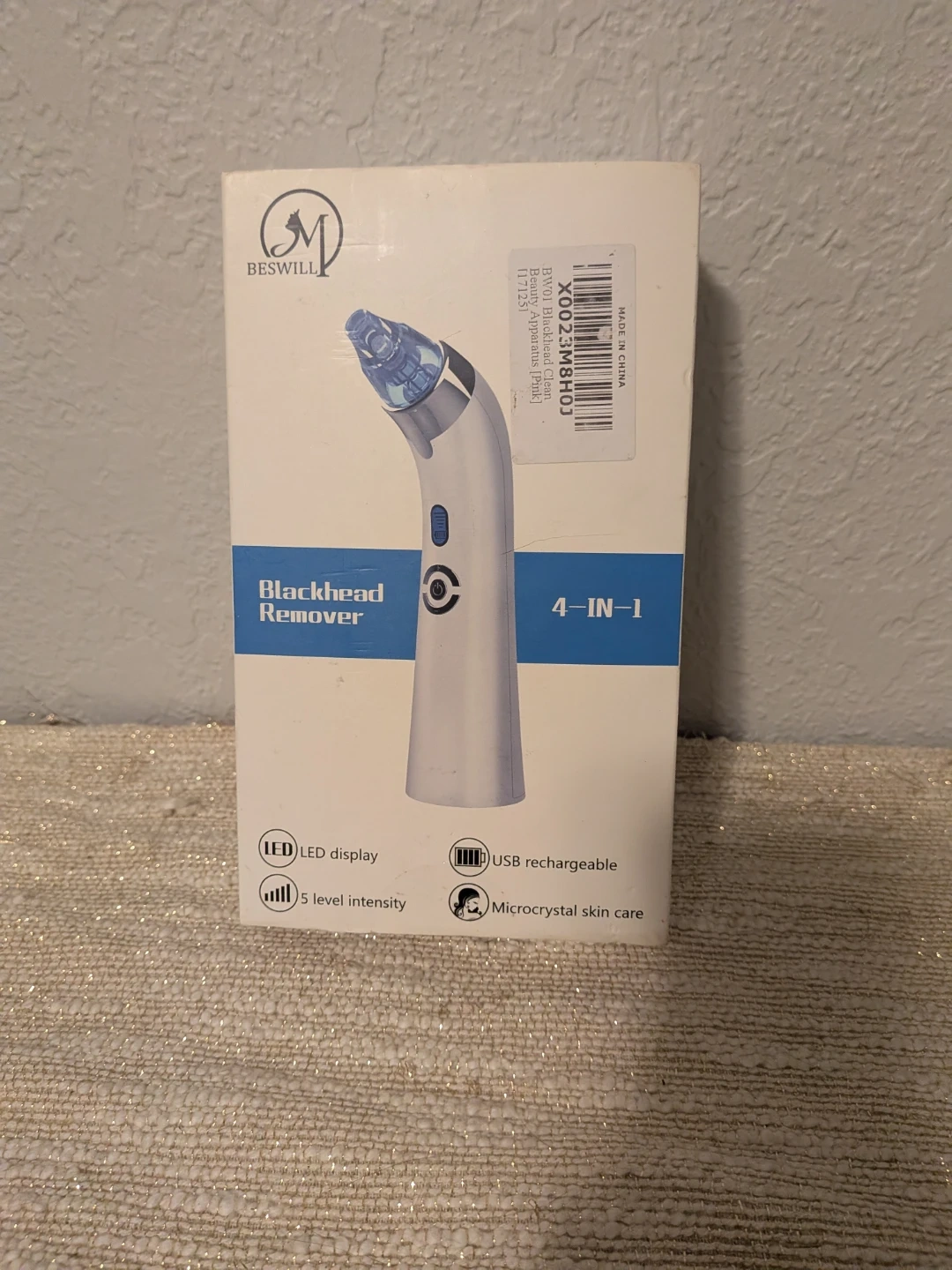 This is a BESWILL 4-in-1 blackhead remover beauty device. It features an LED display and 5 levels of intensity. It's USB rechargeable and includes microcrystal skin care.