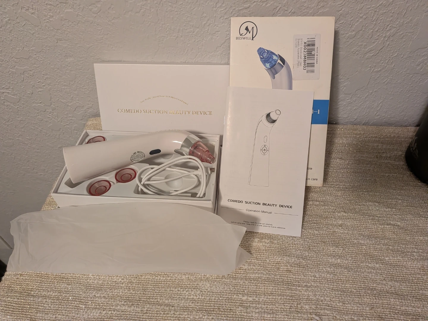 This is a BESWILL 4-in-1 blackhead remover beauty device. It features an LED display and 5 levels of intensity. It's USB rechargeable and includes microcrystal skin care.
