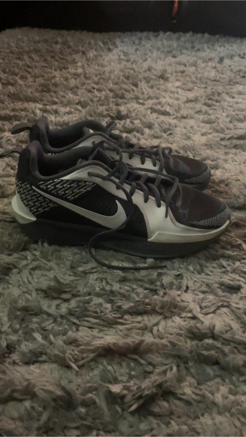 These Nike basketball shoes are black and white. They feature a lace-up closure and rubber soles for grip. Great for playing hoops!
