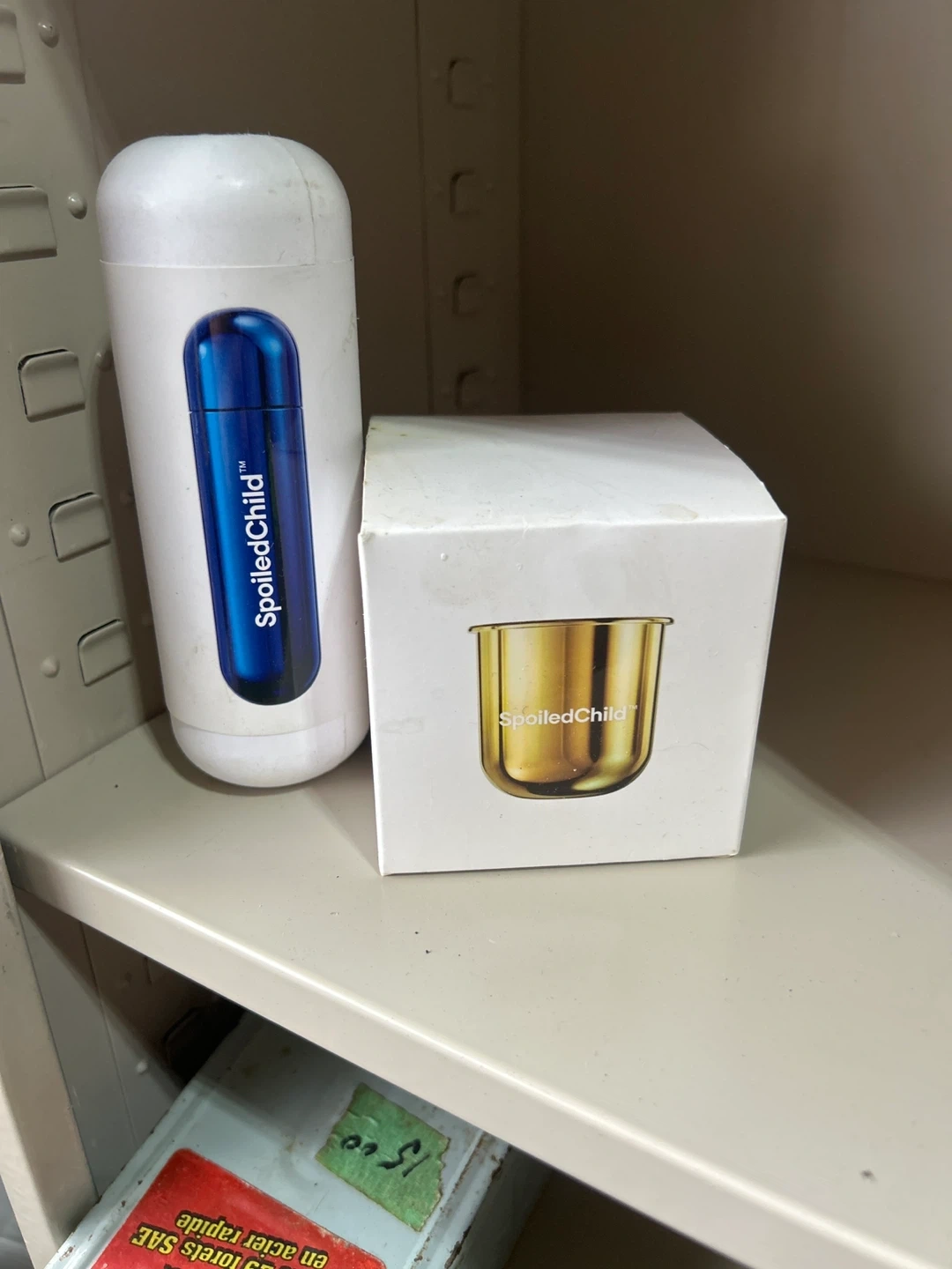 102Selling a set of hair and body products from SpoiledChild. Includes the product in the blue bottle and the product in the gold container. Both come in their original packaging