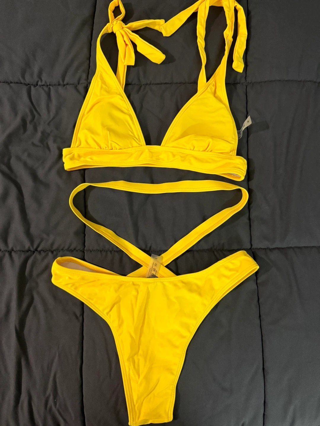 This is a vibrant yellow bikini set. It features adjustable tie straps on the top and a unique criss-cross design on the high-waisted bottoms. It's perfect for your next beach vacation or pool day!