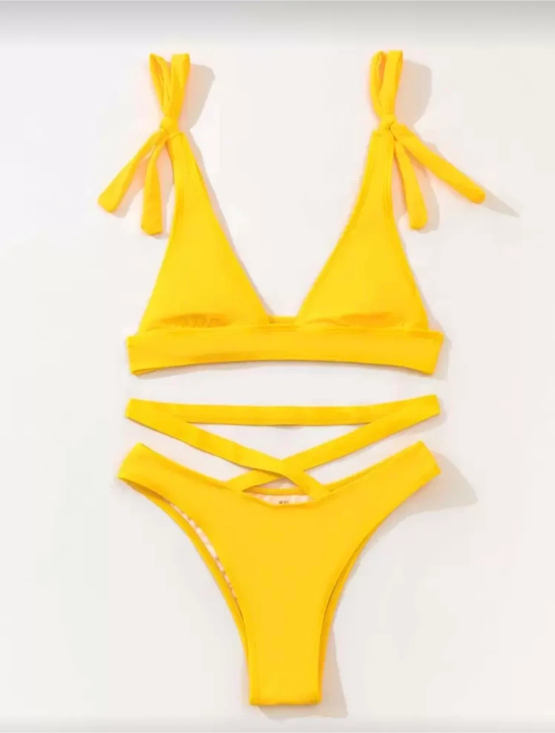 This is a vibrant yellow bikini set. It features adjustable tie straps on the top and a unique criss-cross design on the high-waisted bottoms. It's perfect for your next beach vacation or pool day!