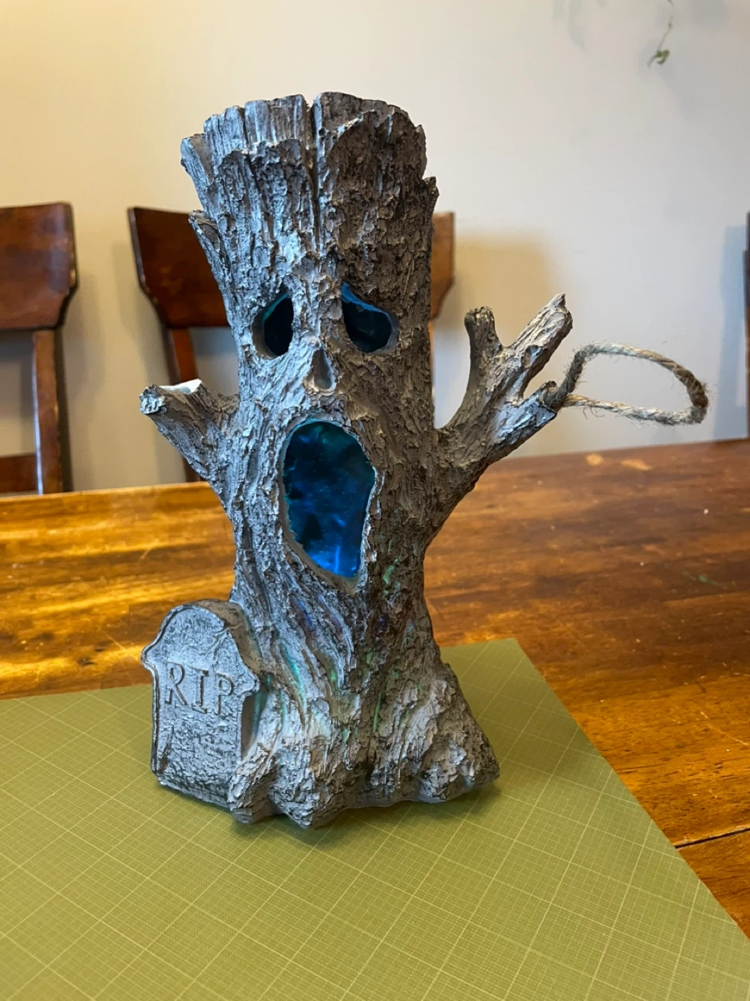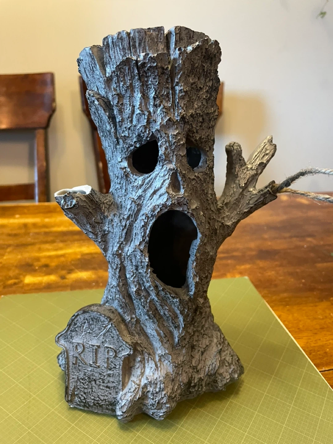 Add some spooky flair to your Halloween decor with this unique tree decoration! It's got a creepy face and a tombstone detail for that extra haunted touch. Perfect for setting the scene for a spooky night