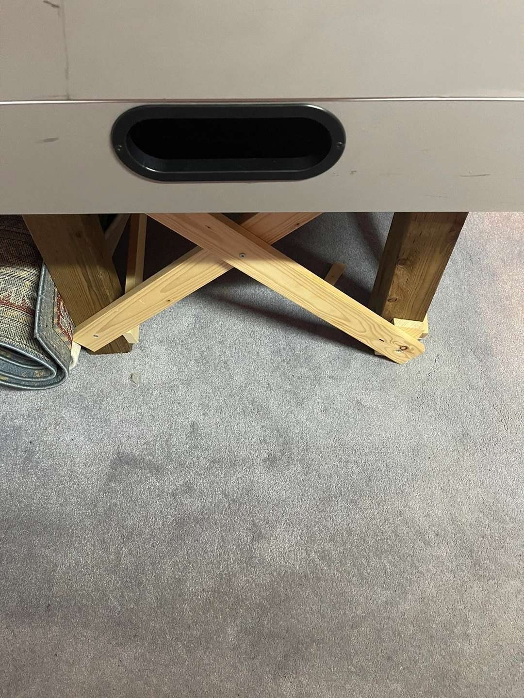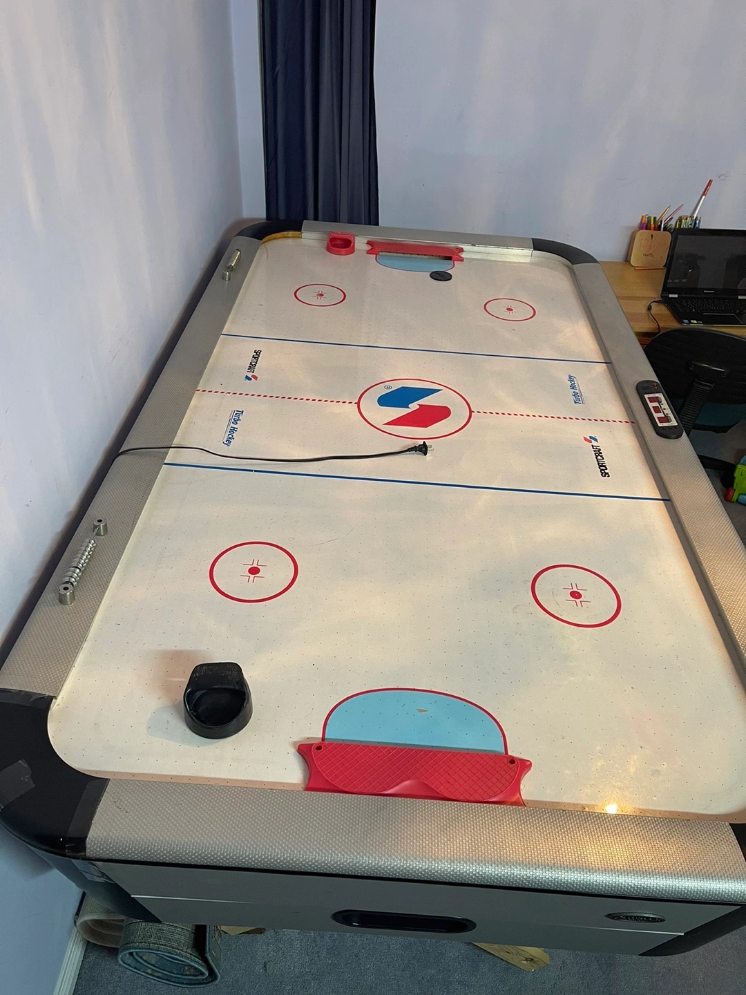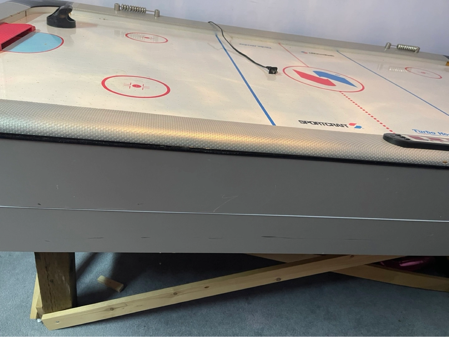 15Air hockey table. Good condition. Some minor scratches and wear. Includes mallets and pucks. Legs are wood