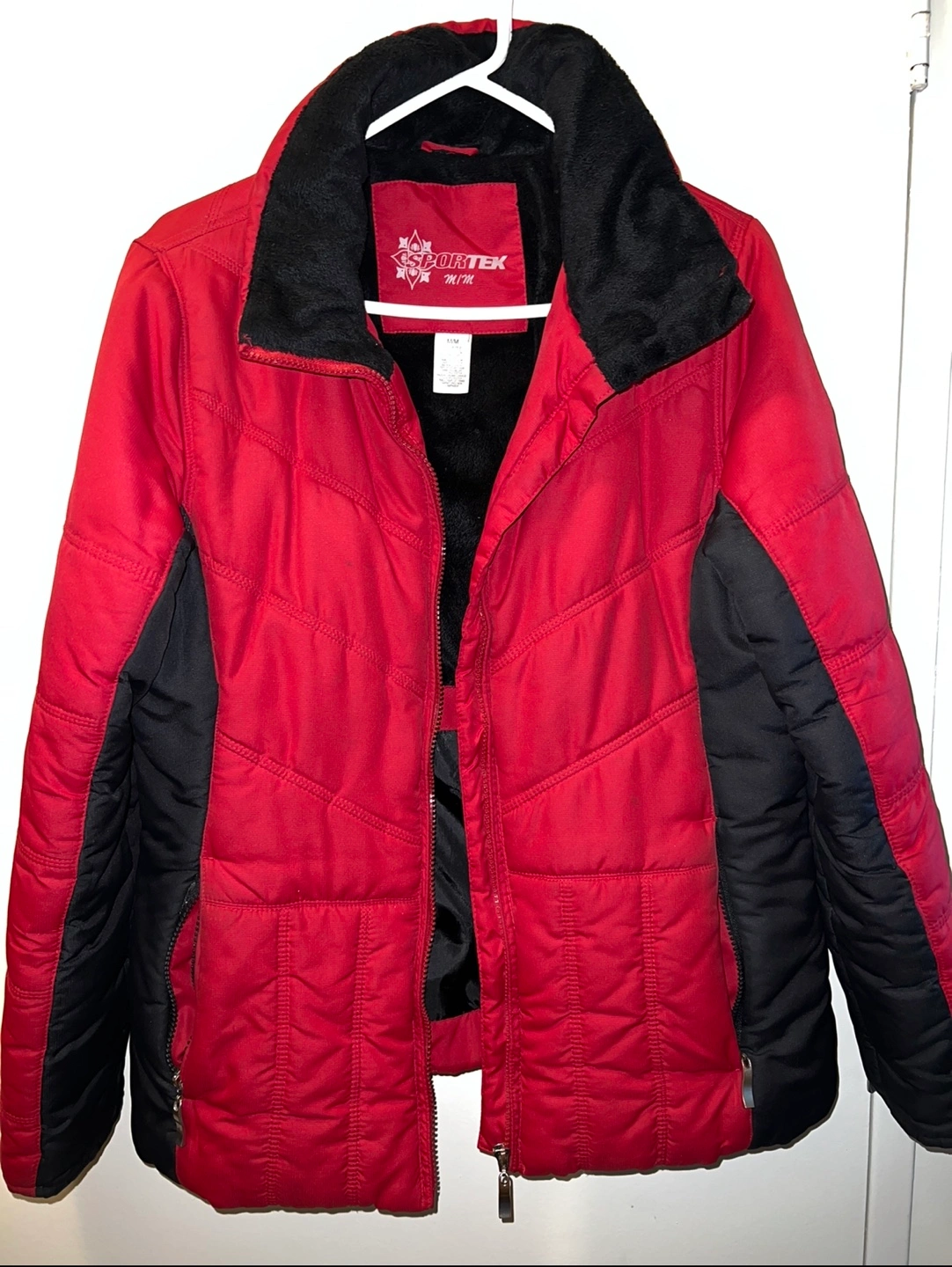 38Cozy Sportek winter jacket in red and black. It's a size M/M and features a warm, furry lining. Perfect for staying snug during the colder months!