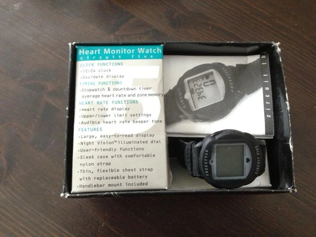 I'm selling a used Freestyle Circuit Five Heart Monitor Watch, a vintage piece for fitness enthusiasts! This watch features a large, easy-to-read display with a night vision illuminated dial, perfect for tracking your heart rate during workouts. It includes user-friendly functions, an audible heart rate beeper tone, and a comfortable nylon strap. This item is in good condition and comes with its original box and handlebar mount. Specifications: * 12/24 clock * Day/date display * Stopwatch & countdown timer * Average heart rate and zone memory * Heart rate settings with upper/lower limit settings * Sleek case with comfortable nylon strap * Thin, flexible chest strap with replaceable battery * Handlebar mount included Whether you're cycling, running, or just monitoring your health, this watch is a reliable companion. Don't let this vintage find pass you by! I'm pricing it at $50. Just needs a battery. If the ad is up, it's still available, so feel free to message me! Happy monitoring!