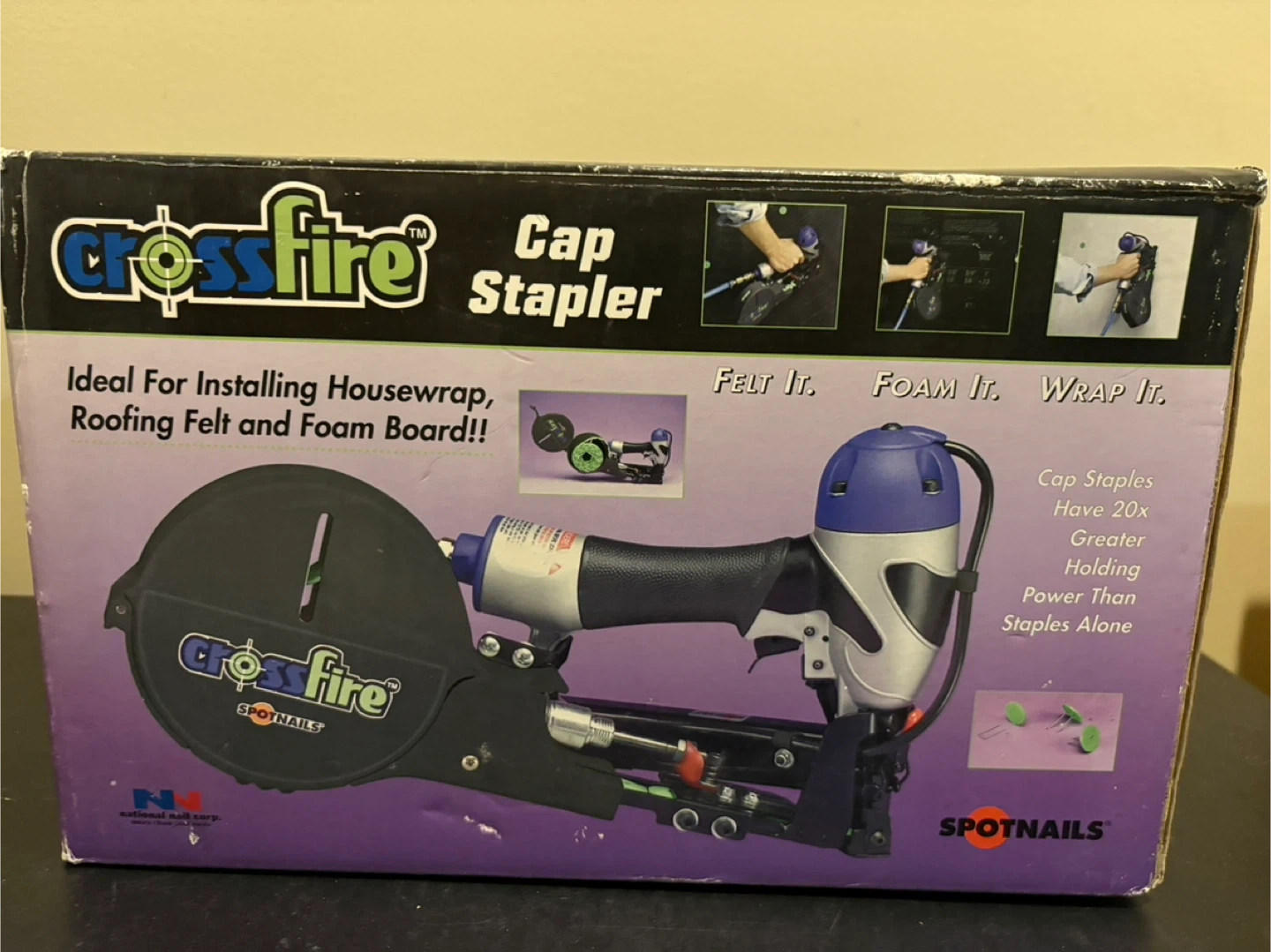 18Selling a Crossfire Cap Stapler that's in great condition! It's ideal for installing housewrap, roofing felt, and foam board. The Crossfire tool is lightweight and easy to use. It's also 10 times faster than hand-driven application! Cap staples have 20x greater holding power than staples alone. Brand new $900+