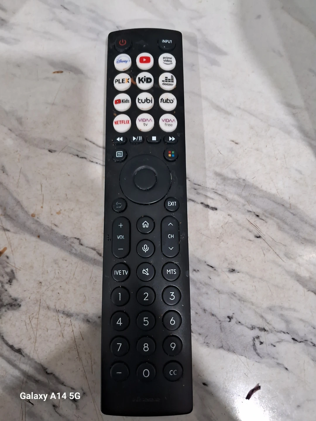 Hiscence remote control has dedicated buttons for various streaming services like Disney+, YouTube, Prime Video, Plex, Netflix, and Tubi. It also includes input selection and volume controls. It's designed for easy access to your favourite apps!