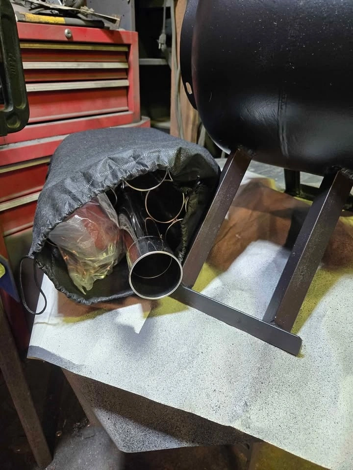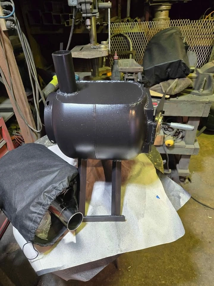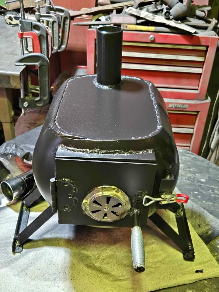 Reliable, ultra-portable heat source for your hot tent, ice shack, or workshop. Custom built for efficiency and ease of transport. Dimensions: Compact 12" x 12" x 8" firebox. Includes a warming plate (perfect for coffee or keeping food warm) and a spring for a stay-cool door handle. High-quality stainless steel chimney kit with multiple interlocking pipe sections, two 90° adjustable elbows, spark arrestor, pipe stabilizer ring, and cords. Silicone roof flashing (stove jack) included for easy tent installation. Freshly coated in high-heat resistant black paint. Everything packs down neatly into the included heavy-duty carry bag. Excellent, custom-built condition. Paint is fresh and drying. Ready for its first burn! Let me know if you're interested!