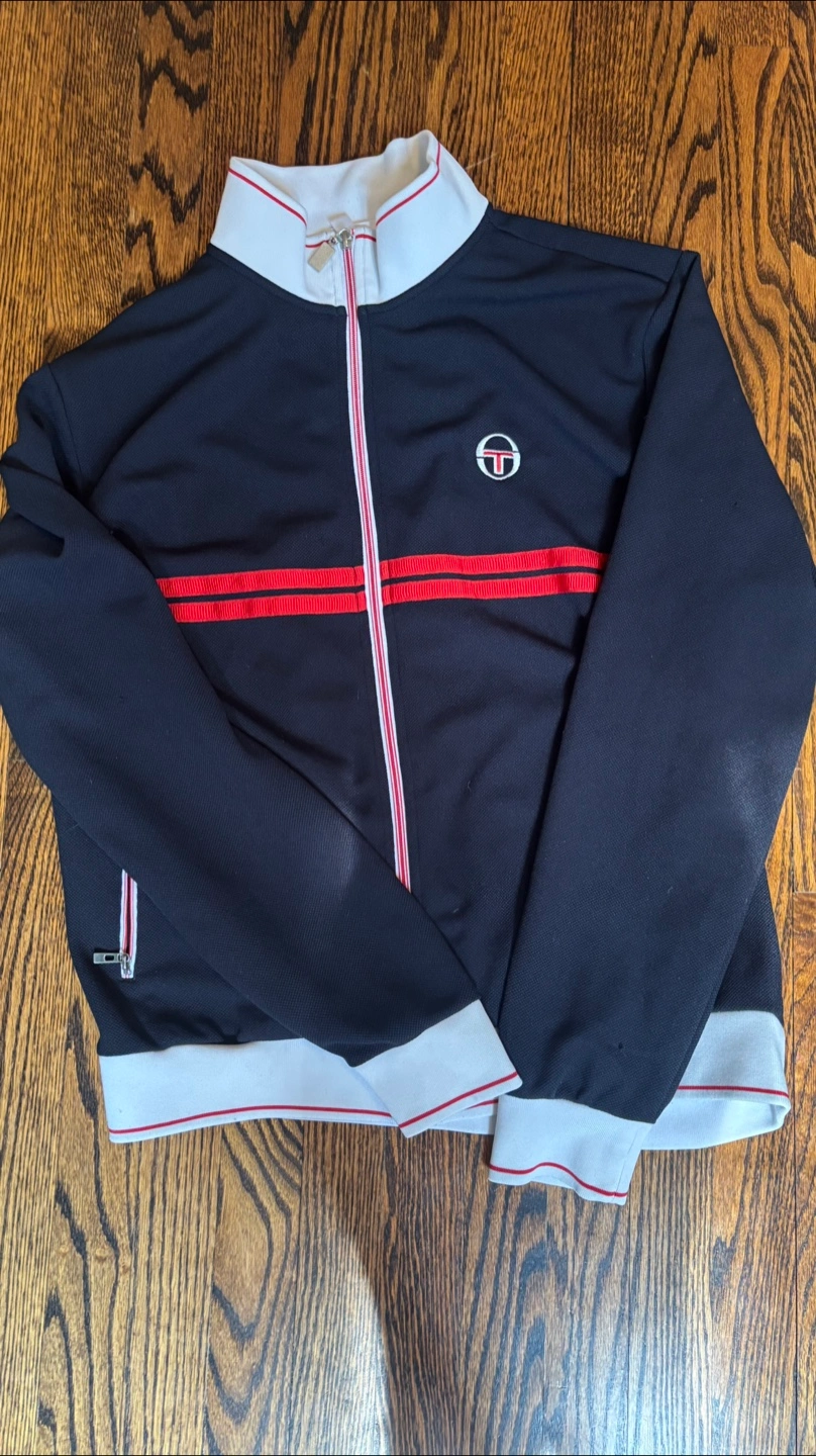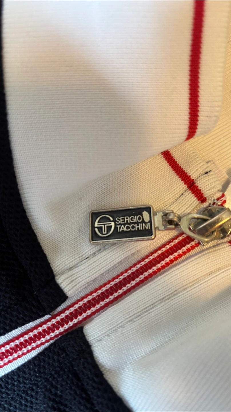 Classic Sergio Tacchini track jacket in a stylish navy blue with red stripes. Worn once.