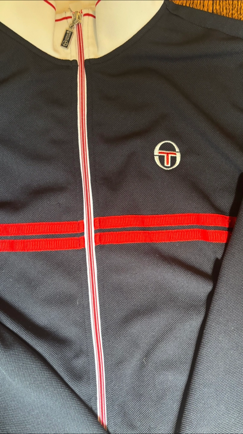 Classic Sergio Tacchini track jacket in a stylish navy blue with red stripes. Worn once.