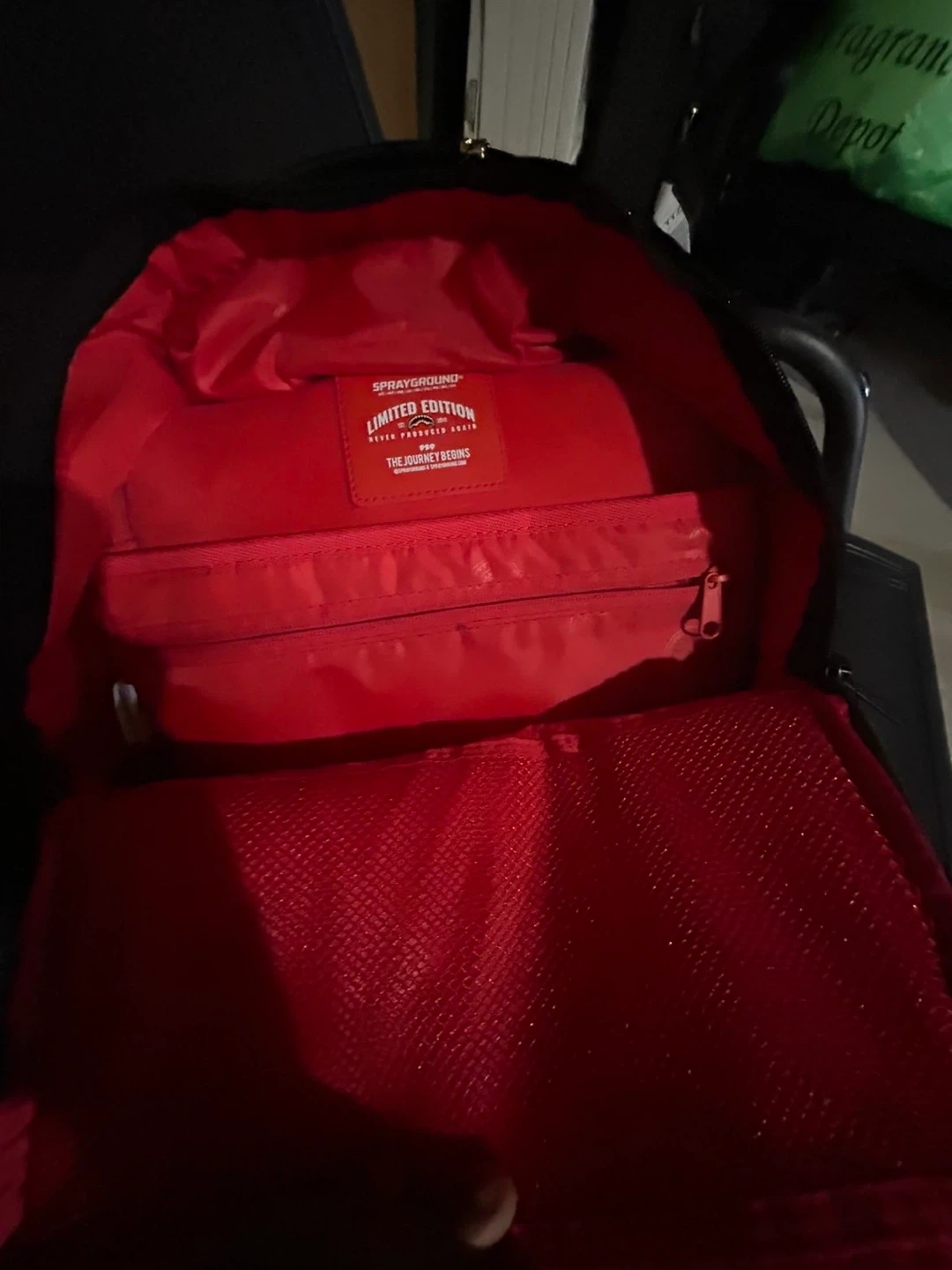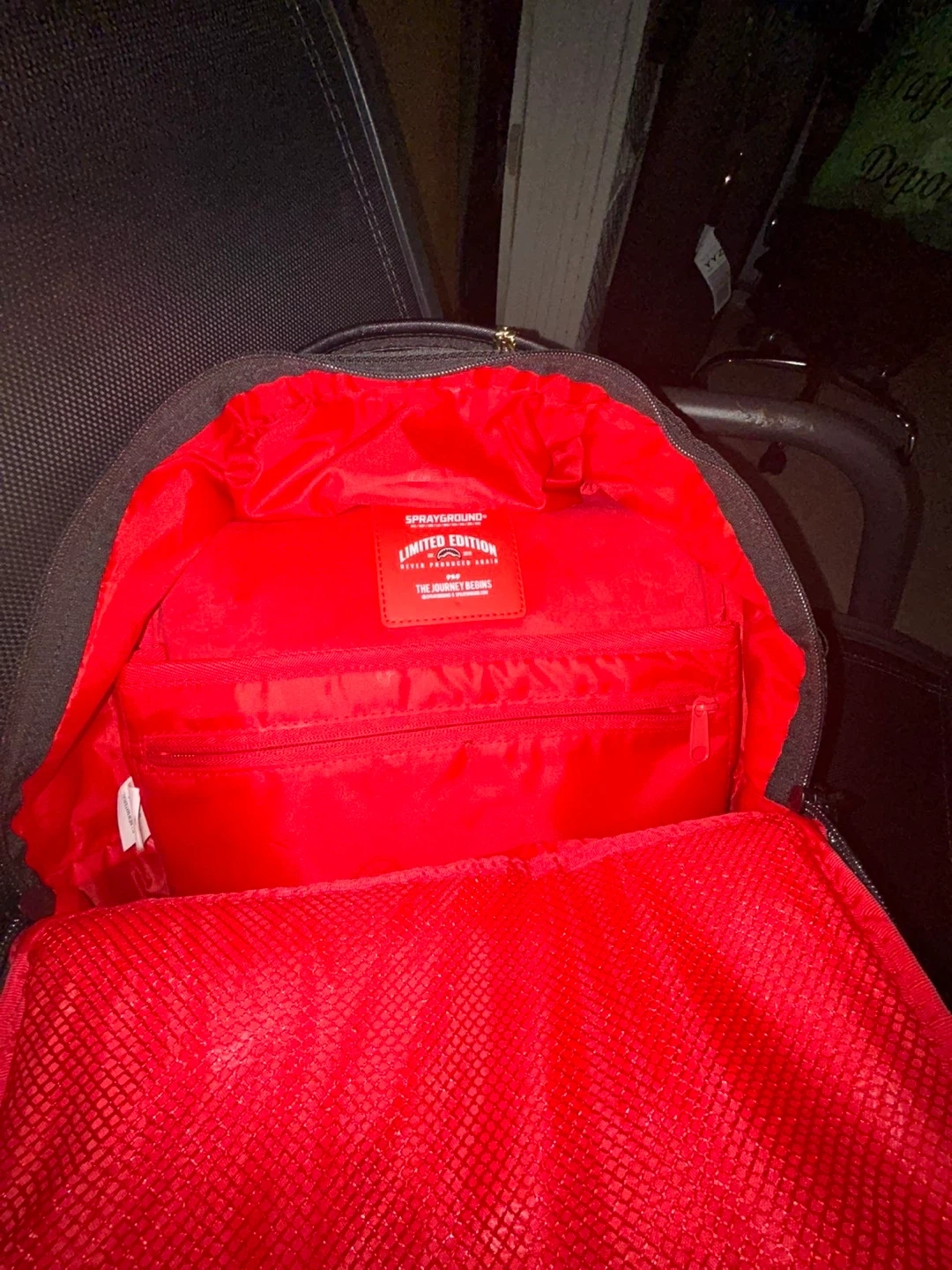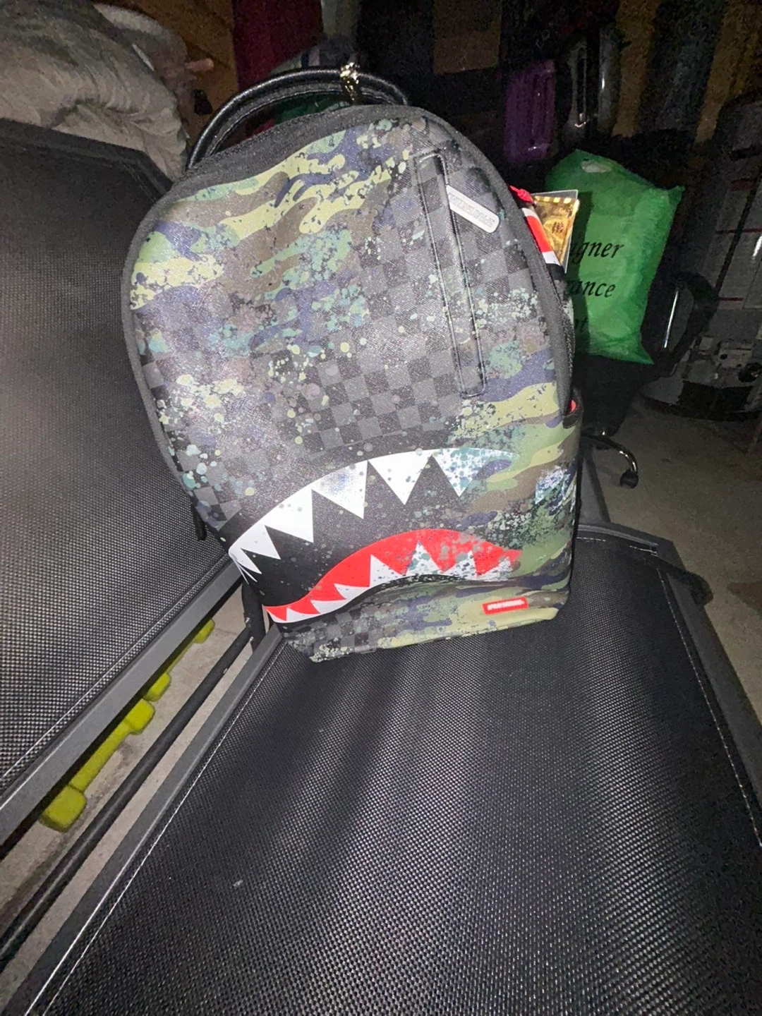 Looking to sell a Sprayground backpack! It's a limited edition design with a cool camo shark pattern. The inside is bright red and has a zippered compartment. Perfect for school or travel!