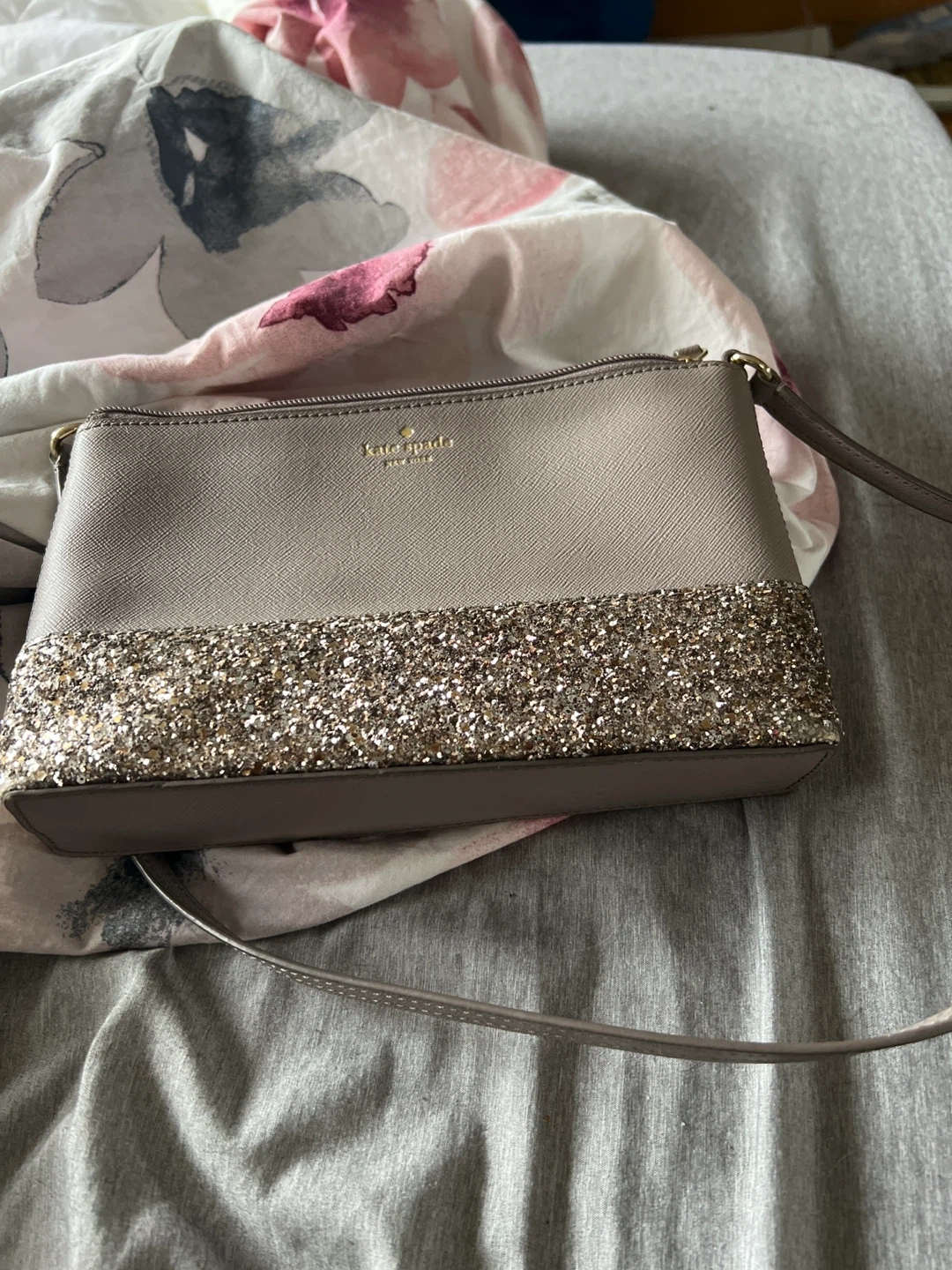 Selling a cute Kate Spade crossbody bag! It's in great condition and has a stylish design with a glittery accent. Perfect for adding a touch of sparkle to your outfit!