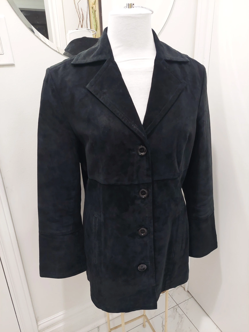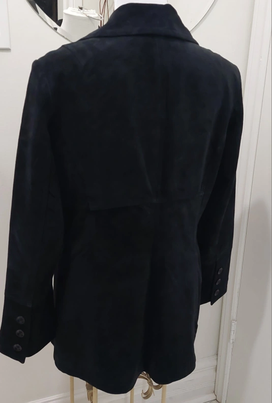Beautiful and stylish Black suede jacket with button closure and pockets. The jacket has long sleeves and a classic collar. unique sleeves with 4 buttons. It's a great piece for chic and fab outings