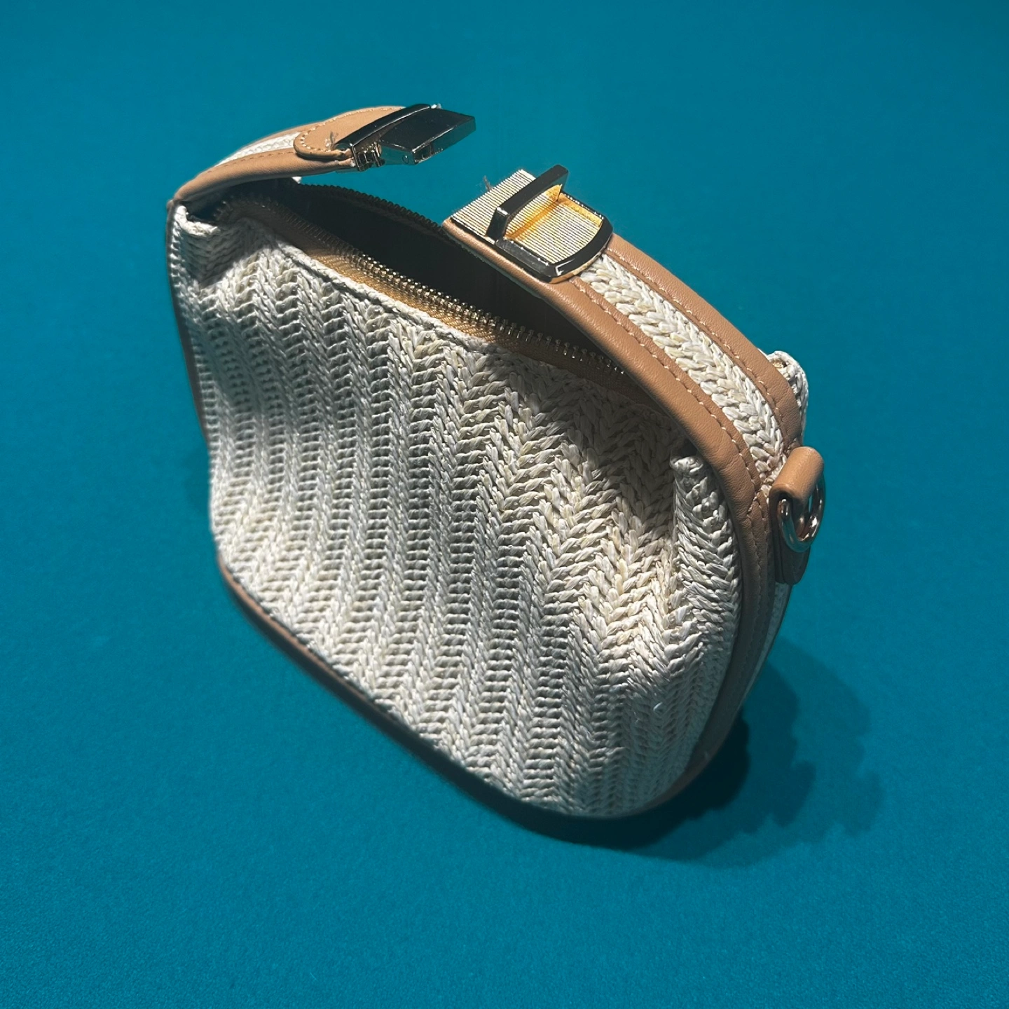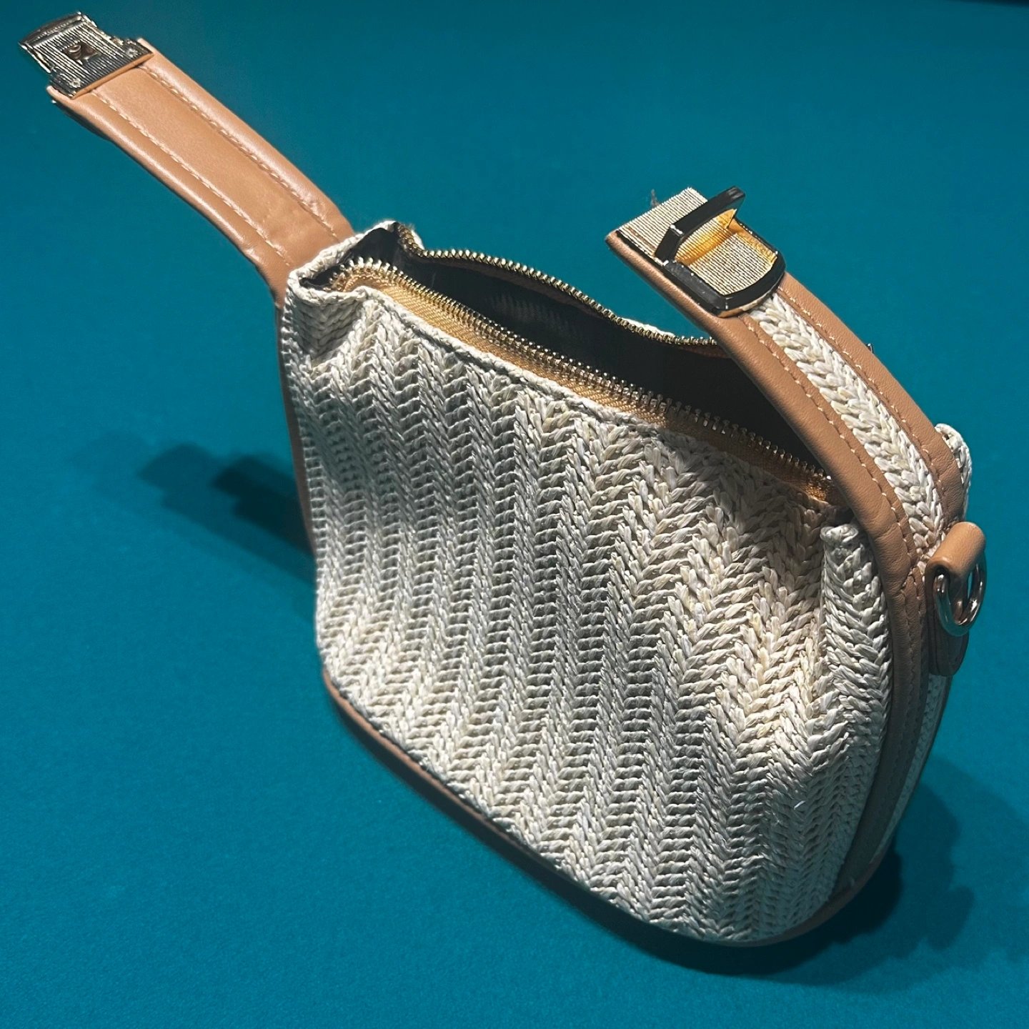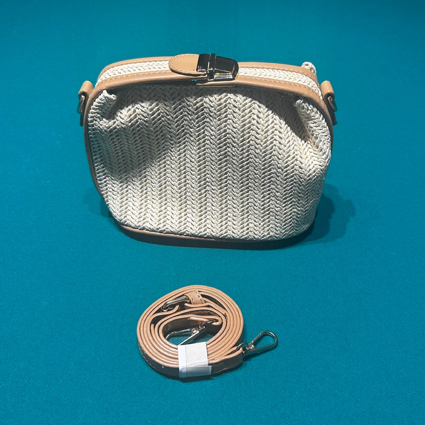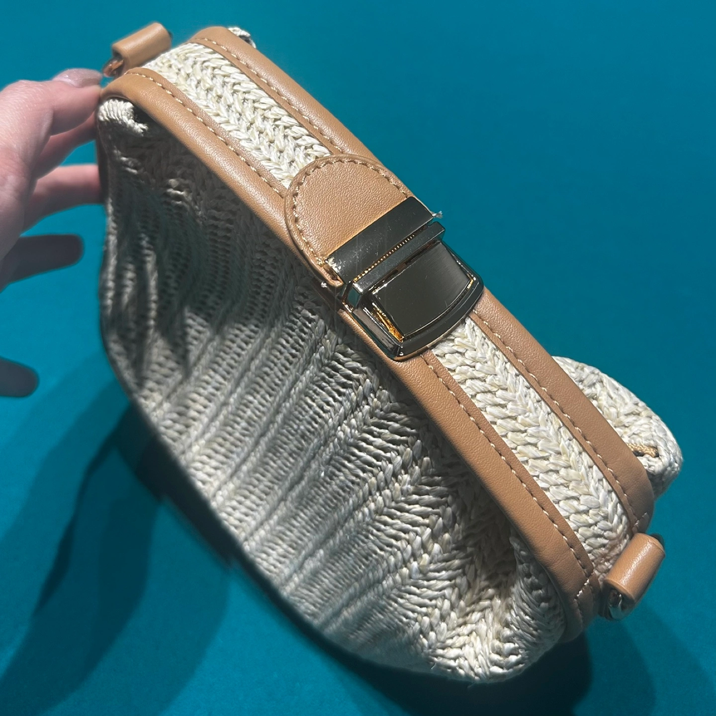 Small woven crossbody bag. Features a tan leather trim and gold clasp. Removable strap included. Perfect for summer. Free with other purchases