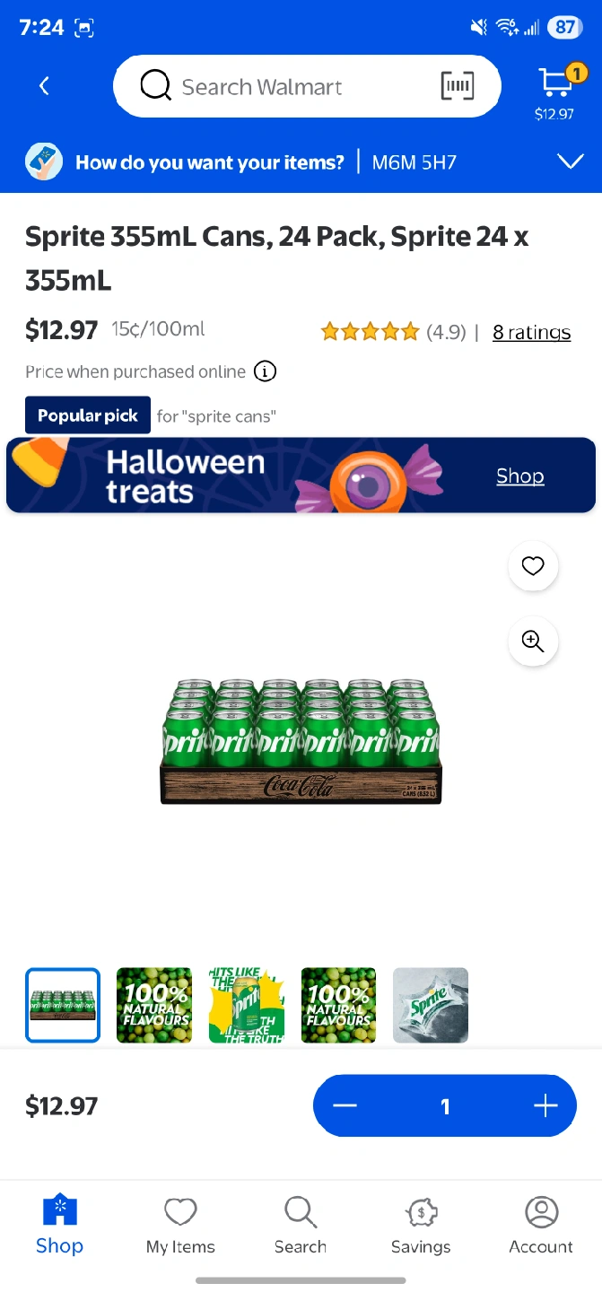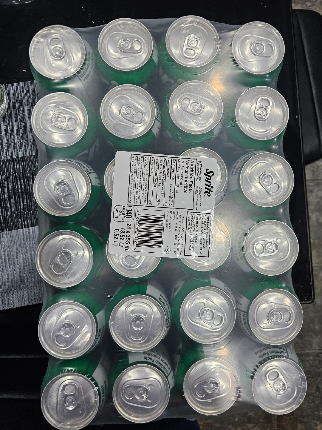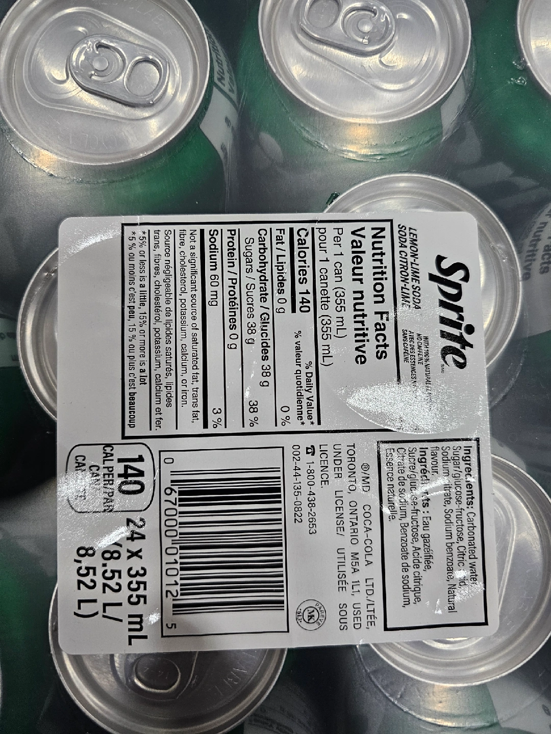 Selling a pack of Sprite, containing 24 cans, each 355mL. Nutrition Facts: - Per 1 can (355 mL): 140 Calories - Ingredients: Carbonated water, sugar/glucose-fructose, citric acid, natural flavours, sodium benzoate.