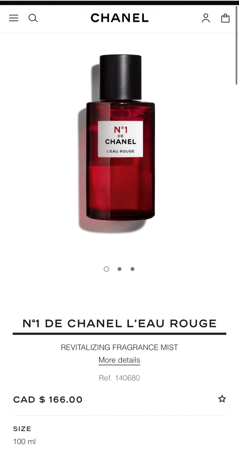 Buy & SellChanel N°1 de Chanel L'Eau Rouge 100mlChanel N°1 de Chanel L'Eau Rouge 100ml$110Selling a bottle of Chanel N°1 de Chanel L'Eau Rouge. It's a 100ml bottle. Originally bought for $166 CAD before tax. Used once to test the scent.ConditionLike newBrandChanelWHERE TO MEETMetrotownView MapSELLERverifiedCindyBurnaby South711 review0 chats·0 favorites·13 viewsSEND CHAT TO SELLERHi Cindy! I’m interested in your listing.Hi Cindy! I’m interested in your listing.Get the Karrot app to chatSign In to chat