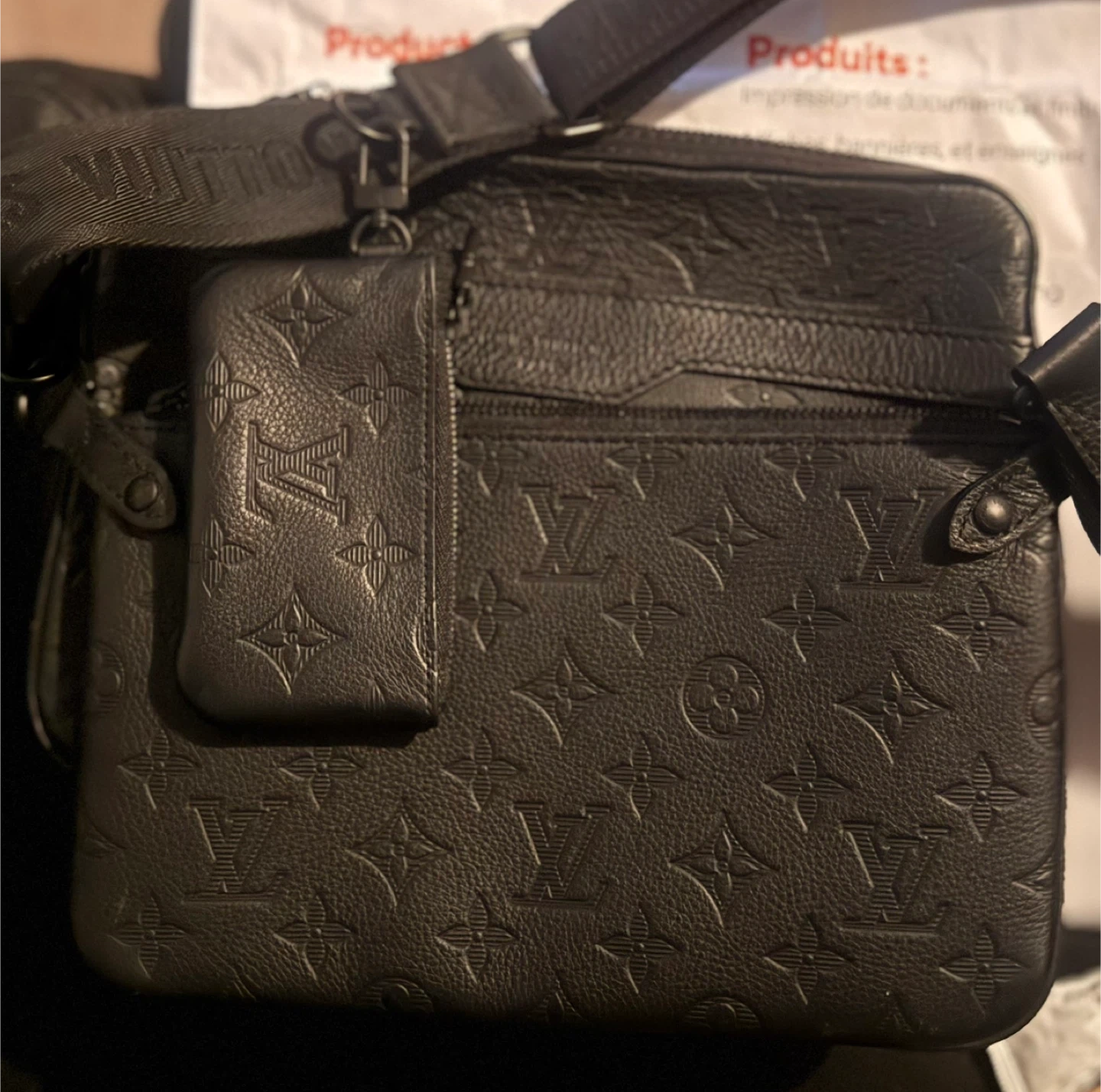 This is a Louis Vuitton messenger bag. It's black with the signature monogram pattern embossed all over. It includes a detachable pouch and adjustable strap. Got receipt for it and we can even meet at the Louis store