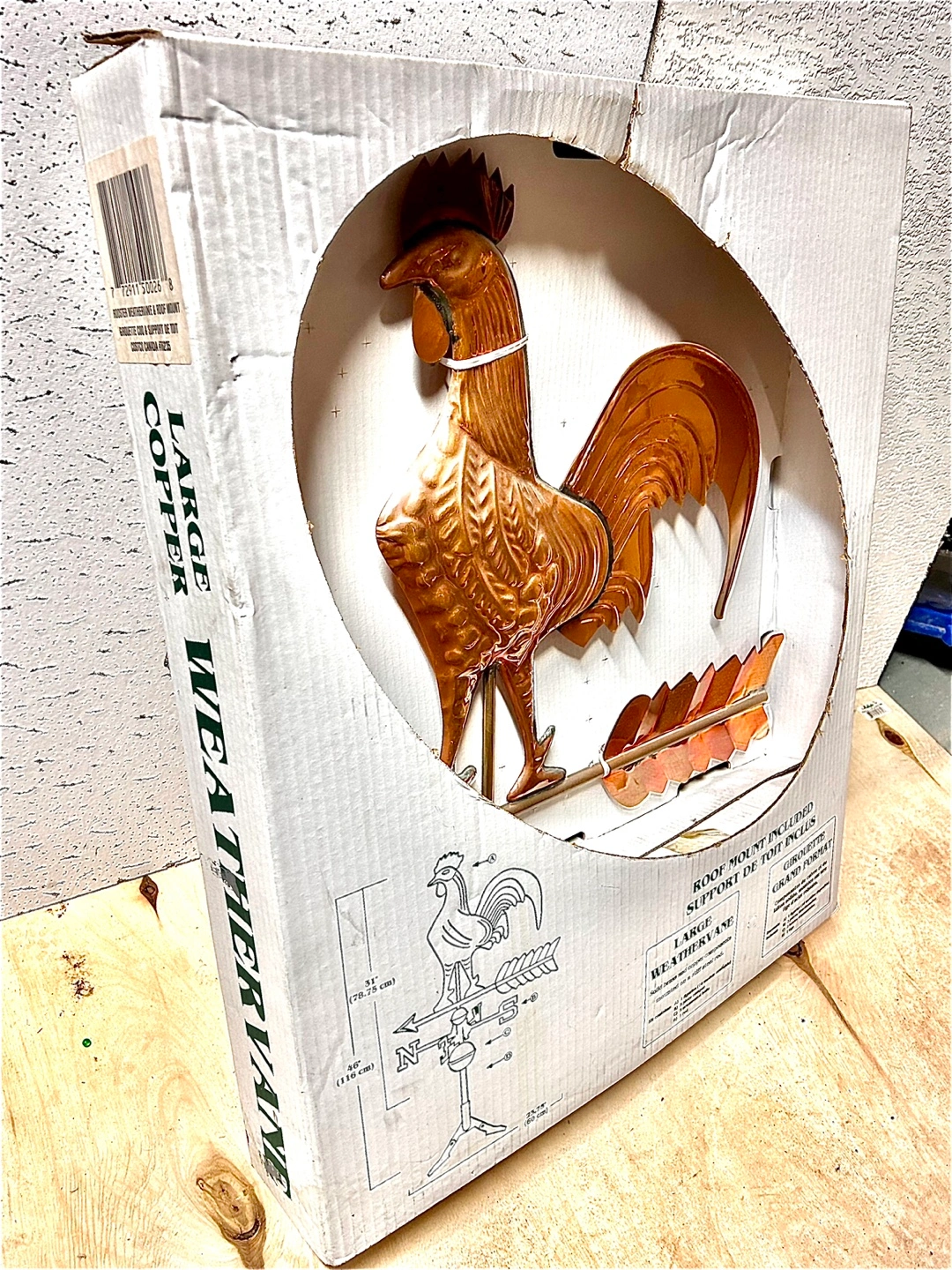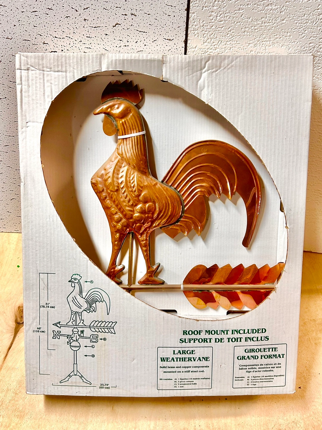 Selling a brand new, large copper weathervane still in its original box! This weathervane features a classic rooster design and is made of copper. It's a great addition to any home or garden, adding a touch of rustic charm. Roof mount included!