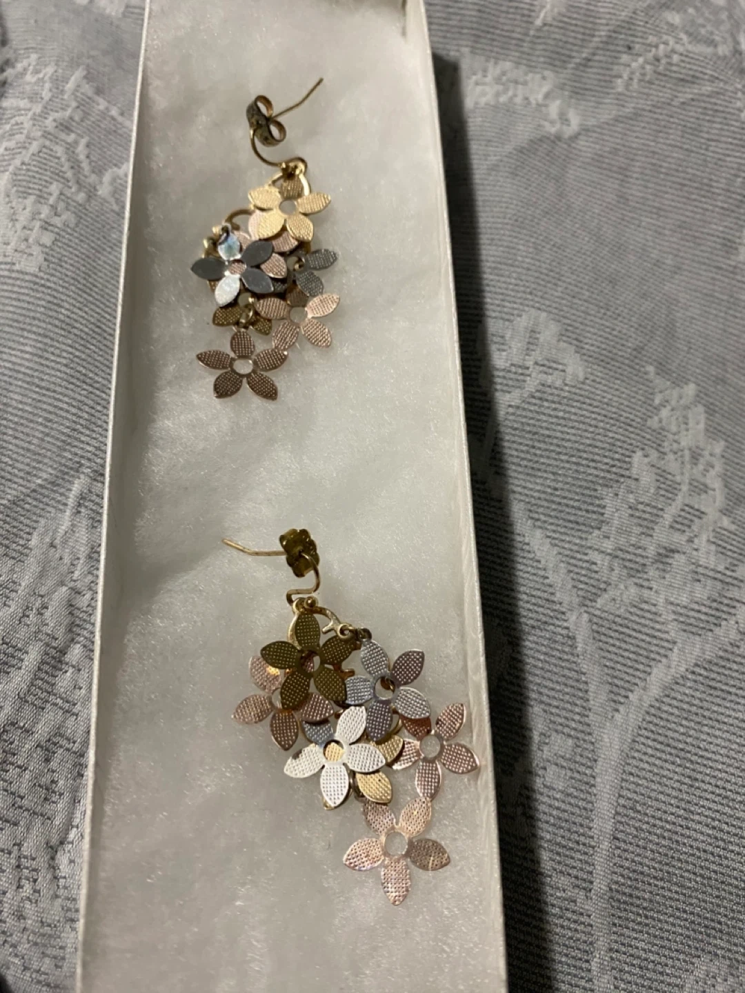 Pretty dangle earrings featuring a cluster of small flowers in a mix of gold, silver, and rose gold tones. These earrings have a delicate design and are presented in a white box.