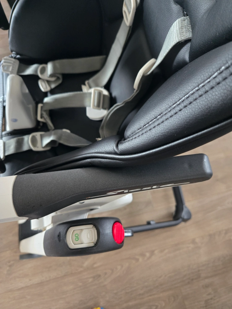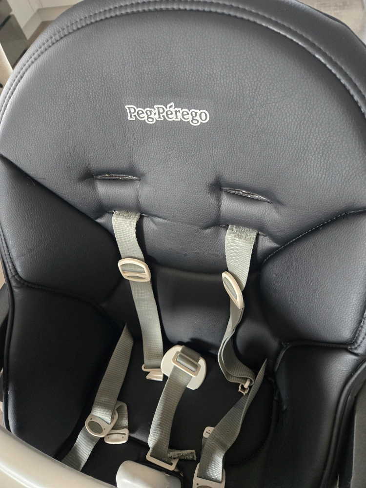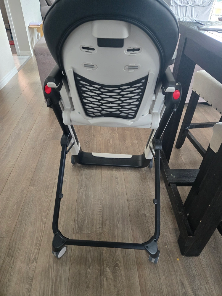 Foldable high chair. Black faux leather seat. Five-point harness. Tray included. Wheels for mobility and they lock for safety.