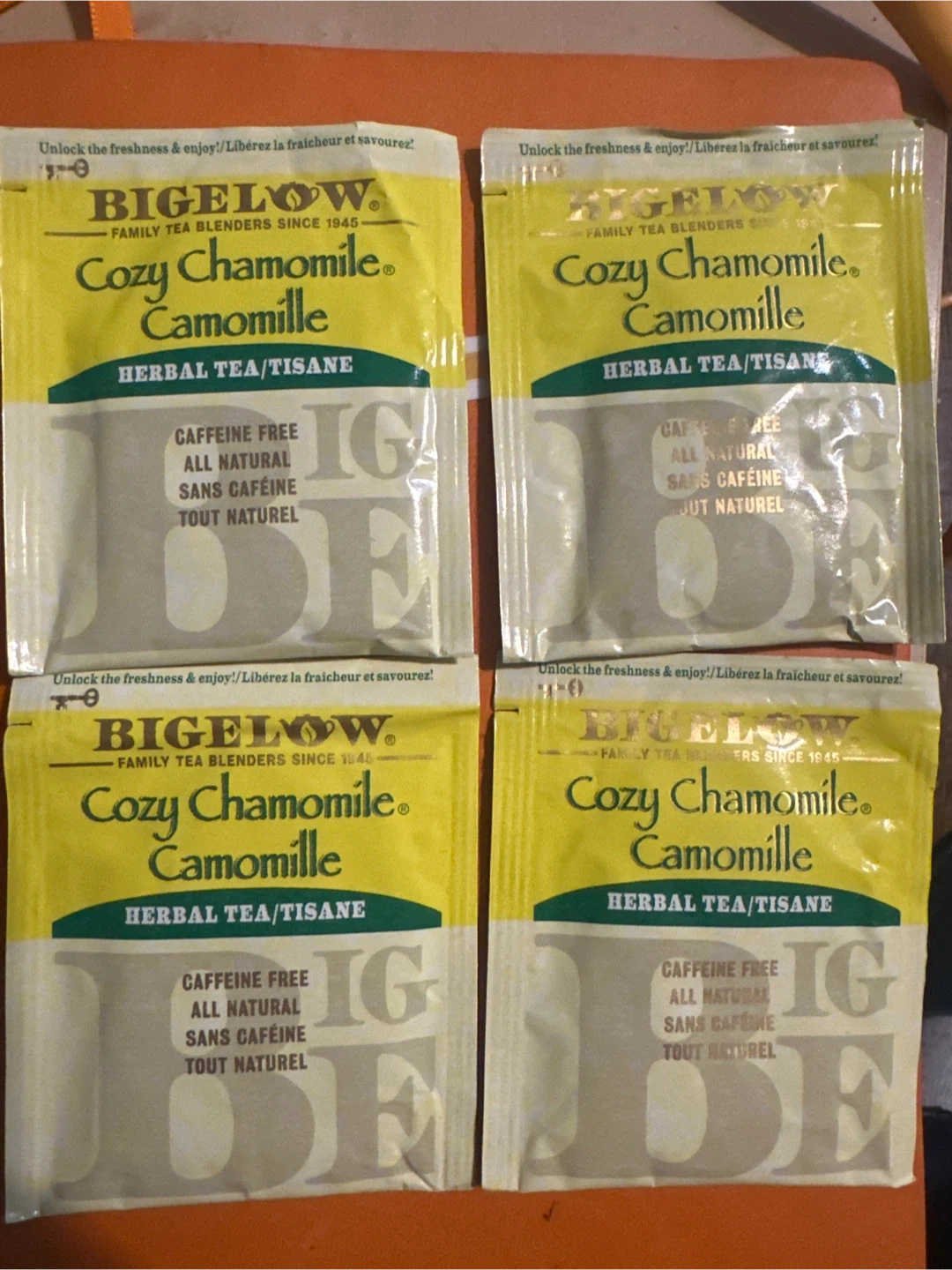 This listing includes four Bigelow Cozy Chamomile herbal tea bags. It's caffeine-free and made with all-natural ingredients. This tea is perfect for a relaxing evening.