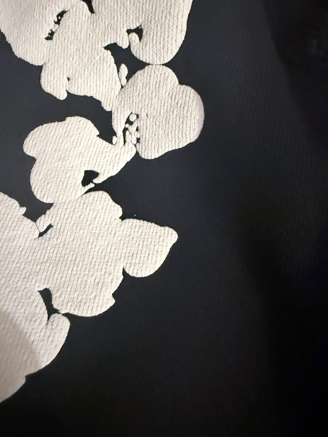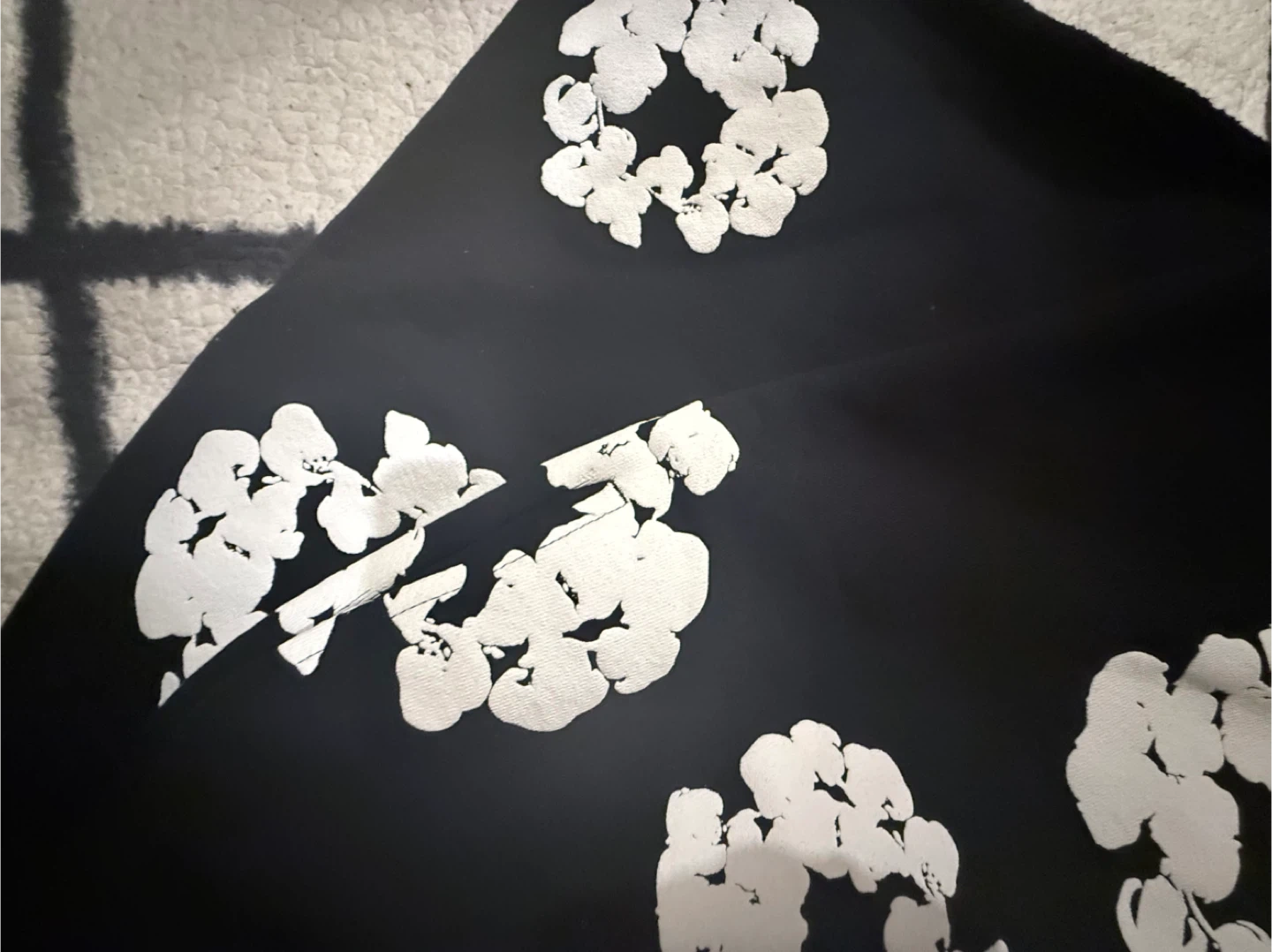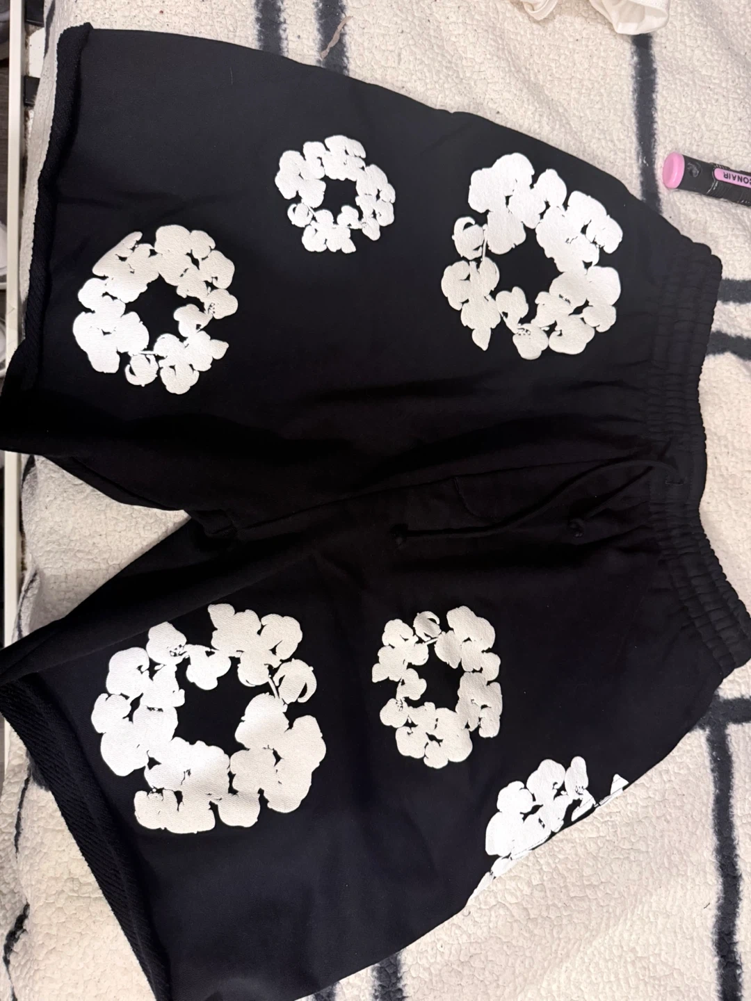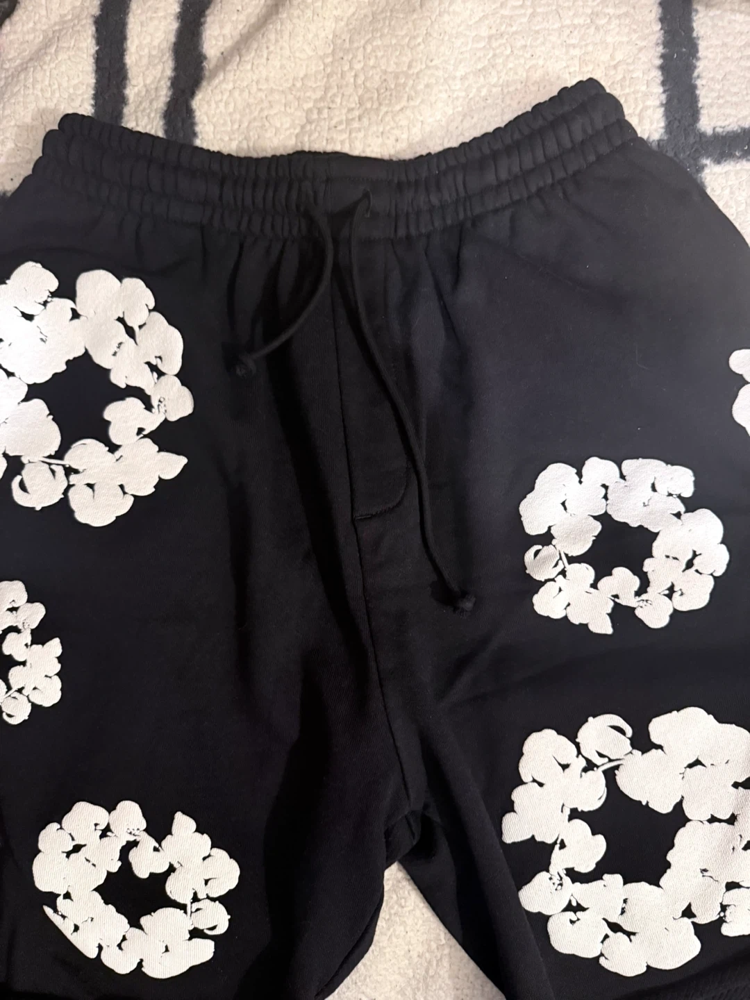 Denim Tears sweat shorts in black with white floral print. Made in Portugal. Size S.