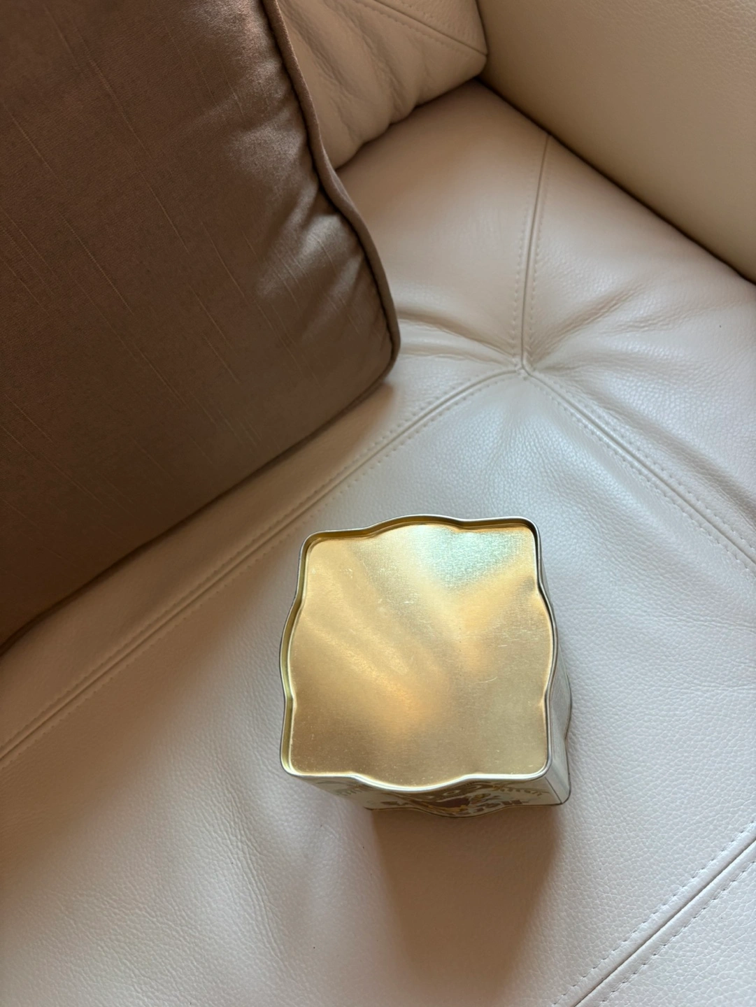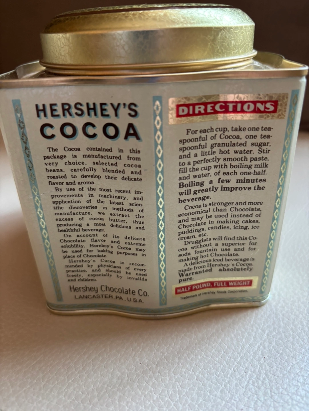 Empty vintage Hershey's Cocoa tin. Half-pound size. Gold-coloured lid and body. Features illustrations and text. Collectible. No scratches.
