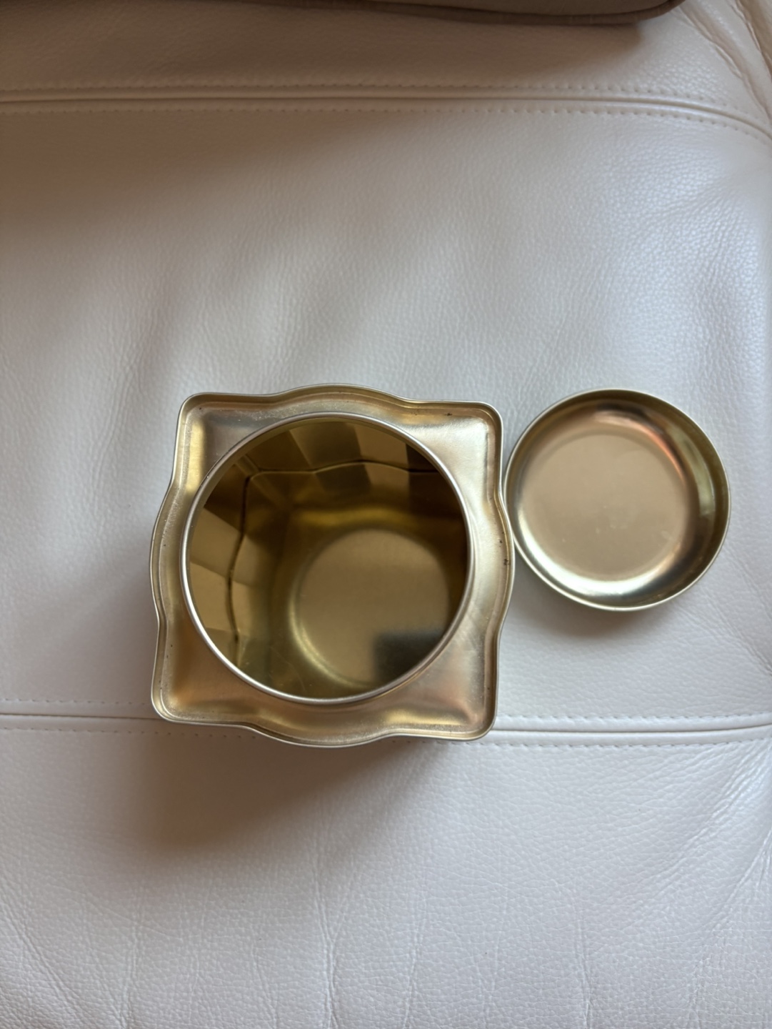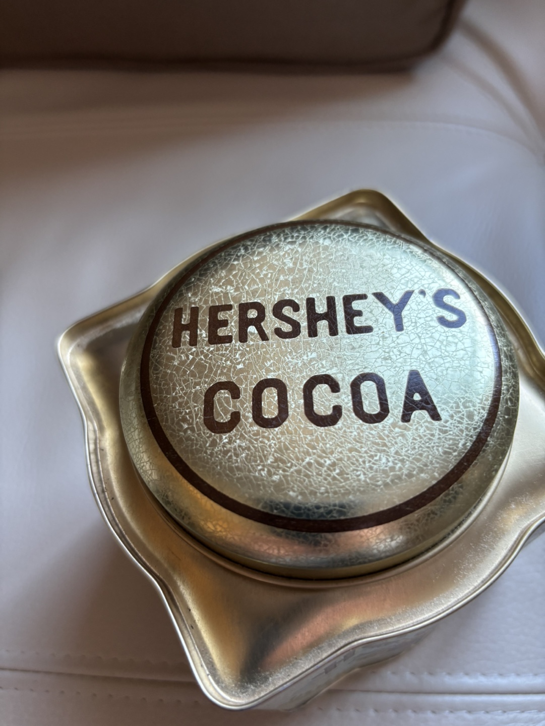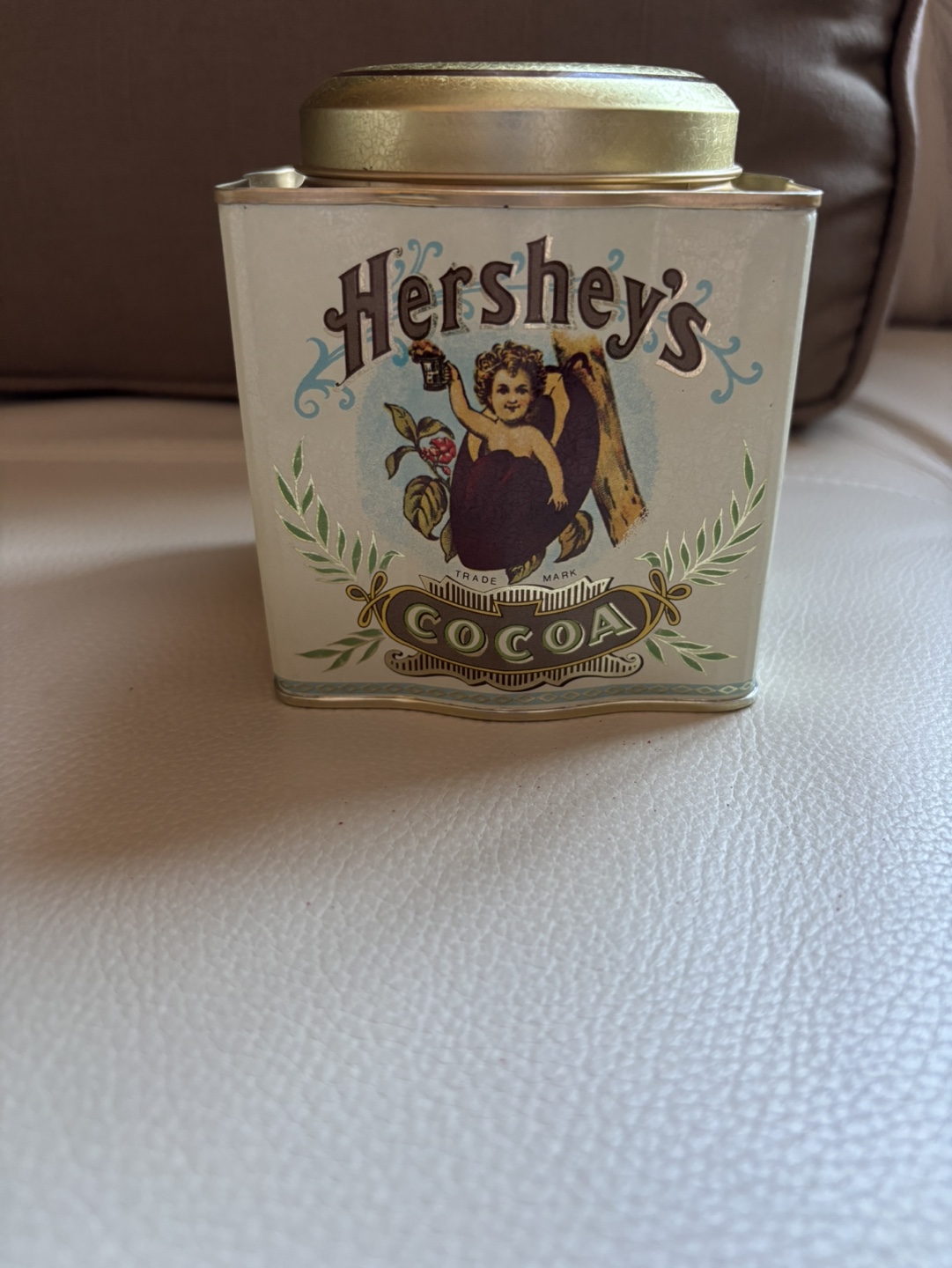 Empty vintage Hershey's Cocoa tin. Half-pound size. Gold-coloured lid and body. Features illustrations and text. Collectible. No scratches.