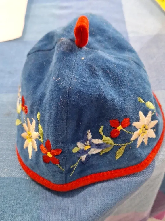 This is a blue hat with floral embroidery and a red trim. It has a small red pom-pom on top. Made of fabric material. Great for Suisse cultural events or as a unique accessory!