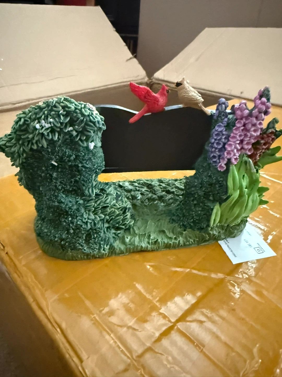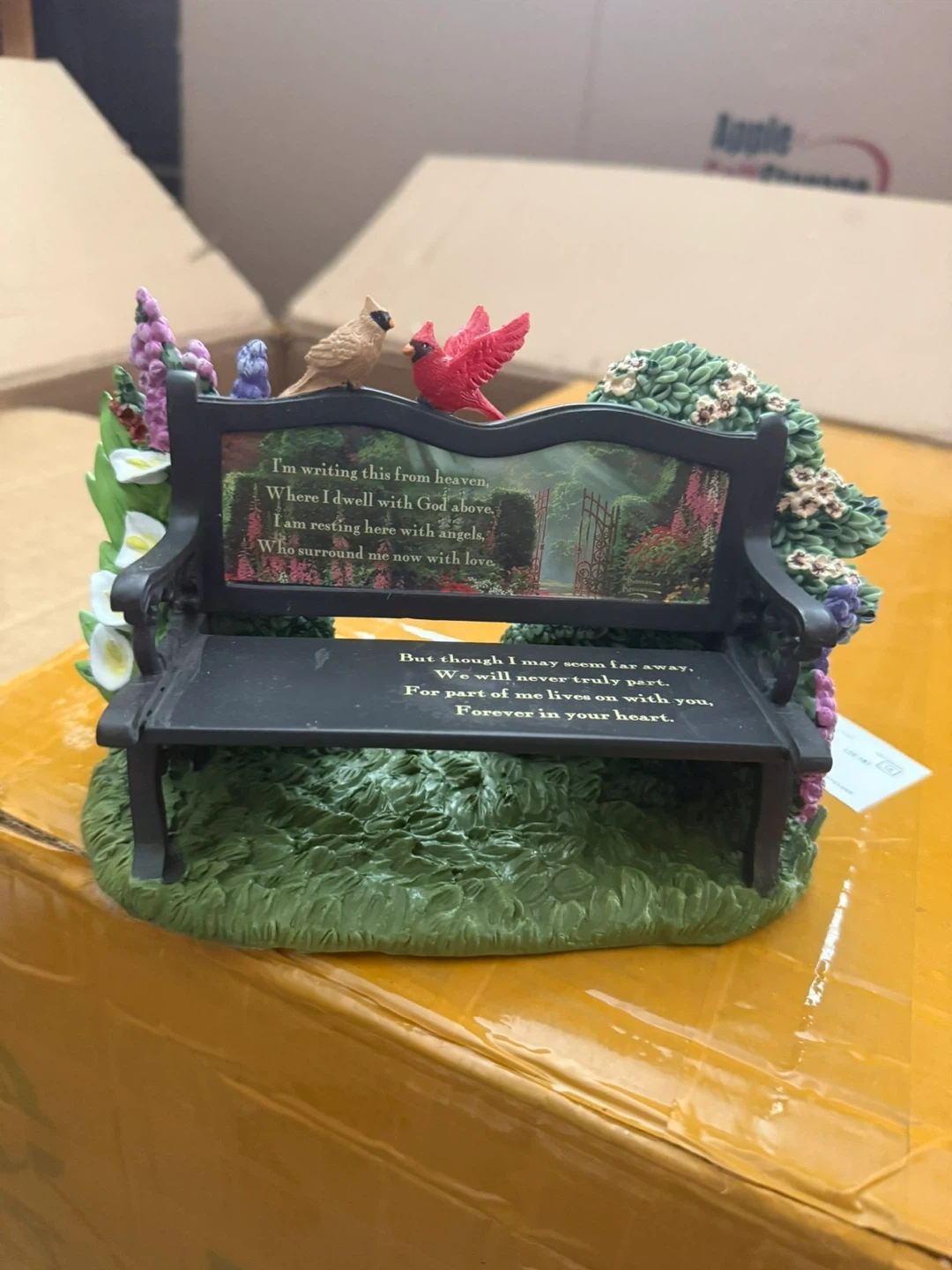 A Thomas Kinkade "Until We Meet Again" limited edition figurine, #8012. This collectible depicts a bench with cardinals and a memorial message. Garden of Grace collection from 2004.
