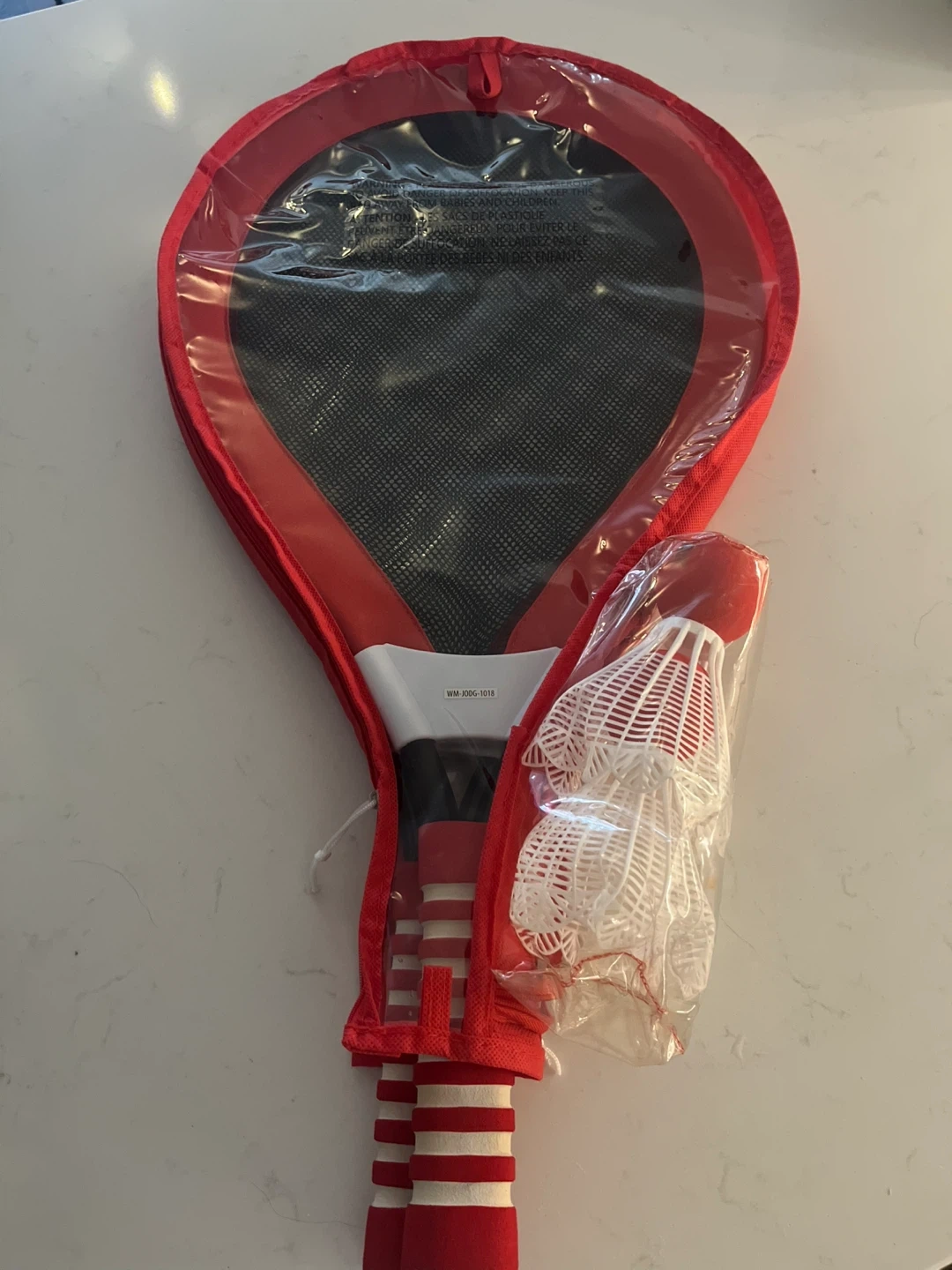 This is a red and white jumbo badminton racket set. It includes two rackets and two shuttlecocks. The rackets have a white grip with red stripes and come in a red carrying case.