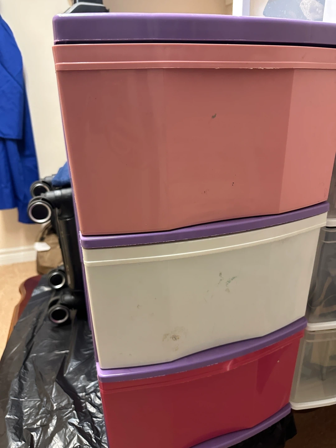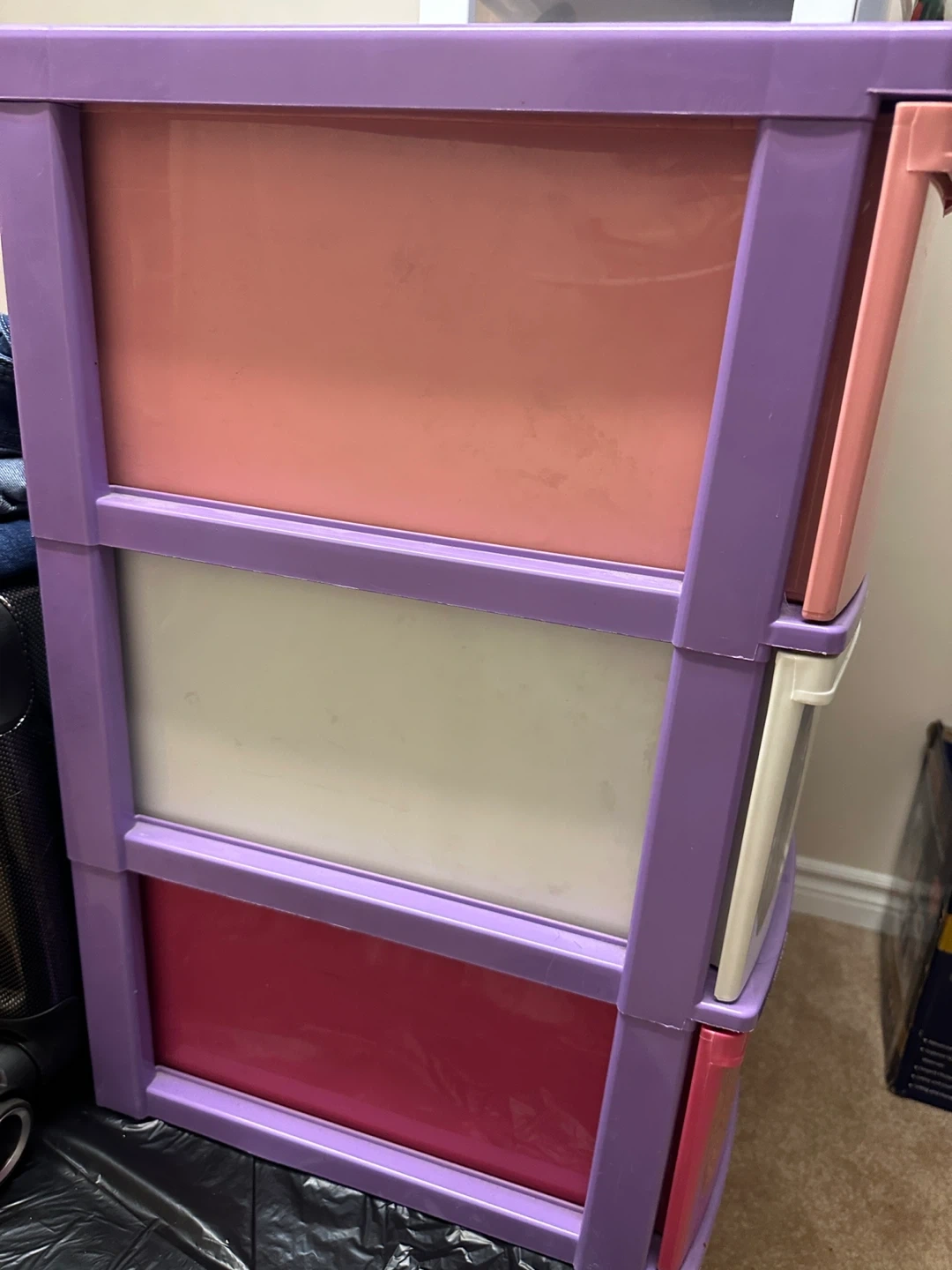 This is a plastic drawer storage unit. It has three drawers in various colours: pink, white, and red. The frame is purple plastic. It's suitable for organizing small items.