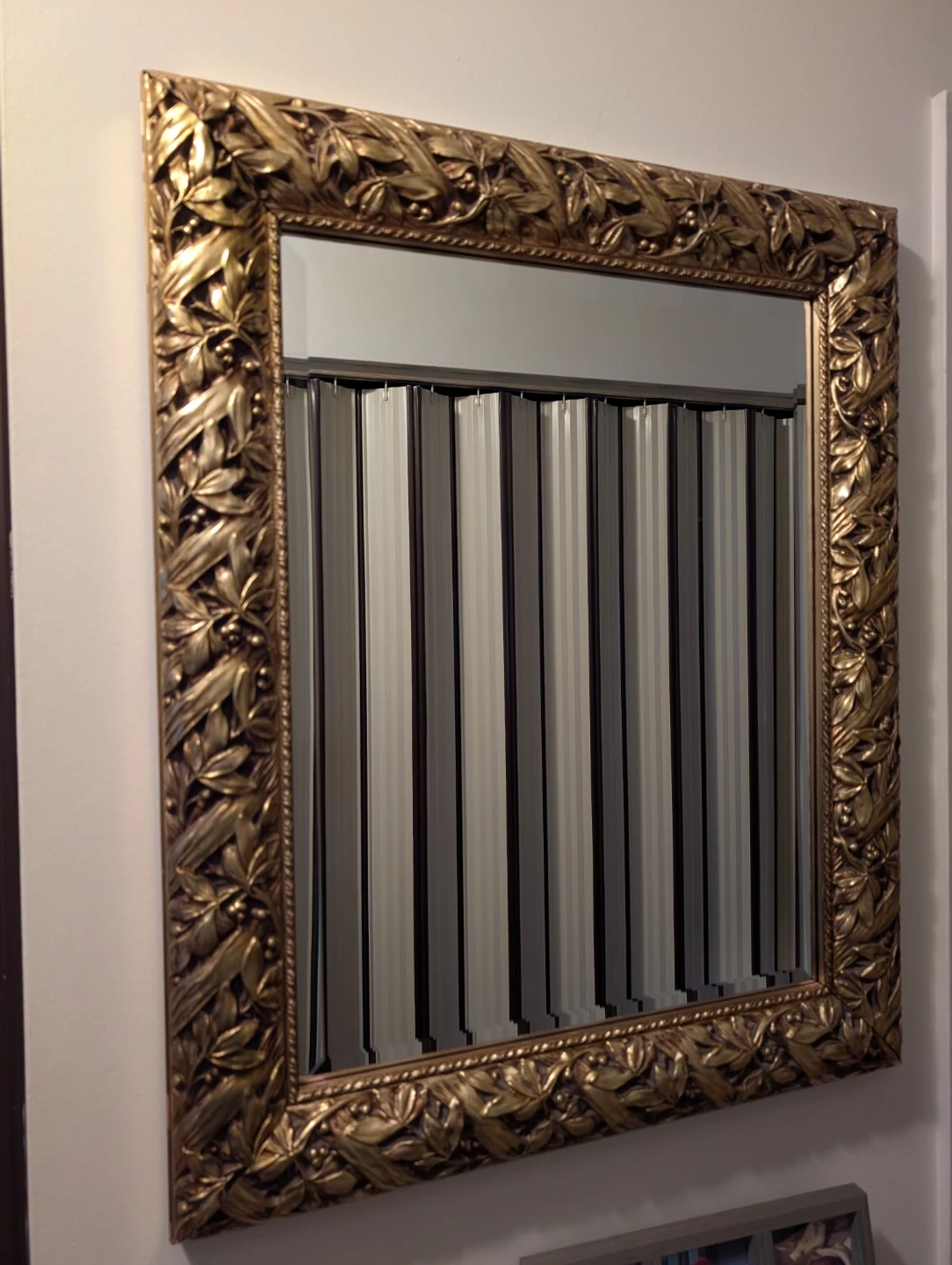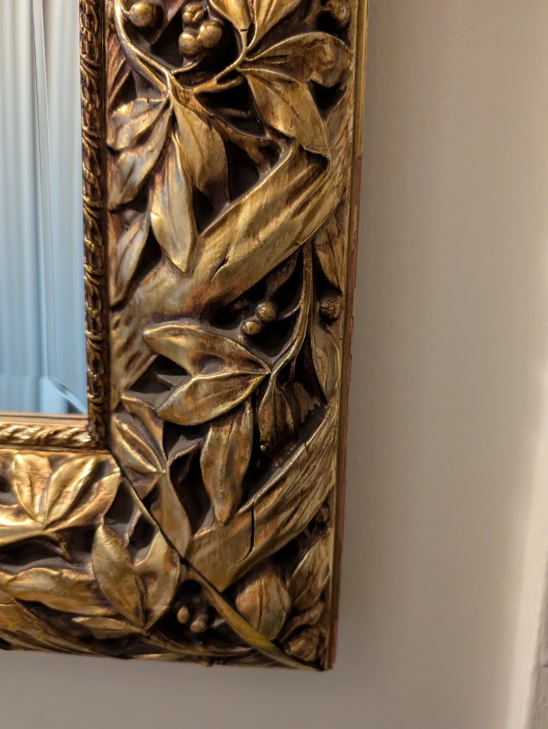 This wall mirror features an ornate gold-tone frame with a detailed leaf and berry motif. It's a beautiful vintage accent piece that adds a touch of elegance to any room. The frame is made of wood with a metallic finish.