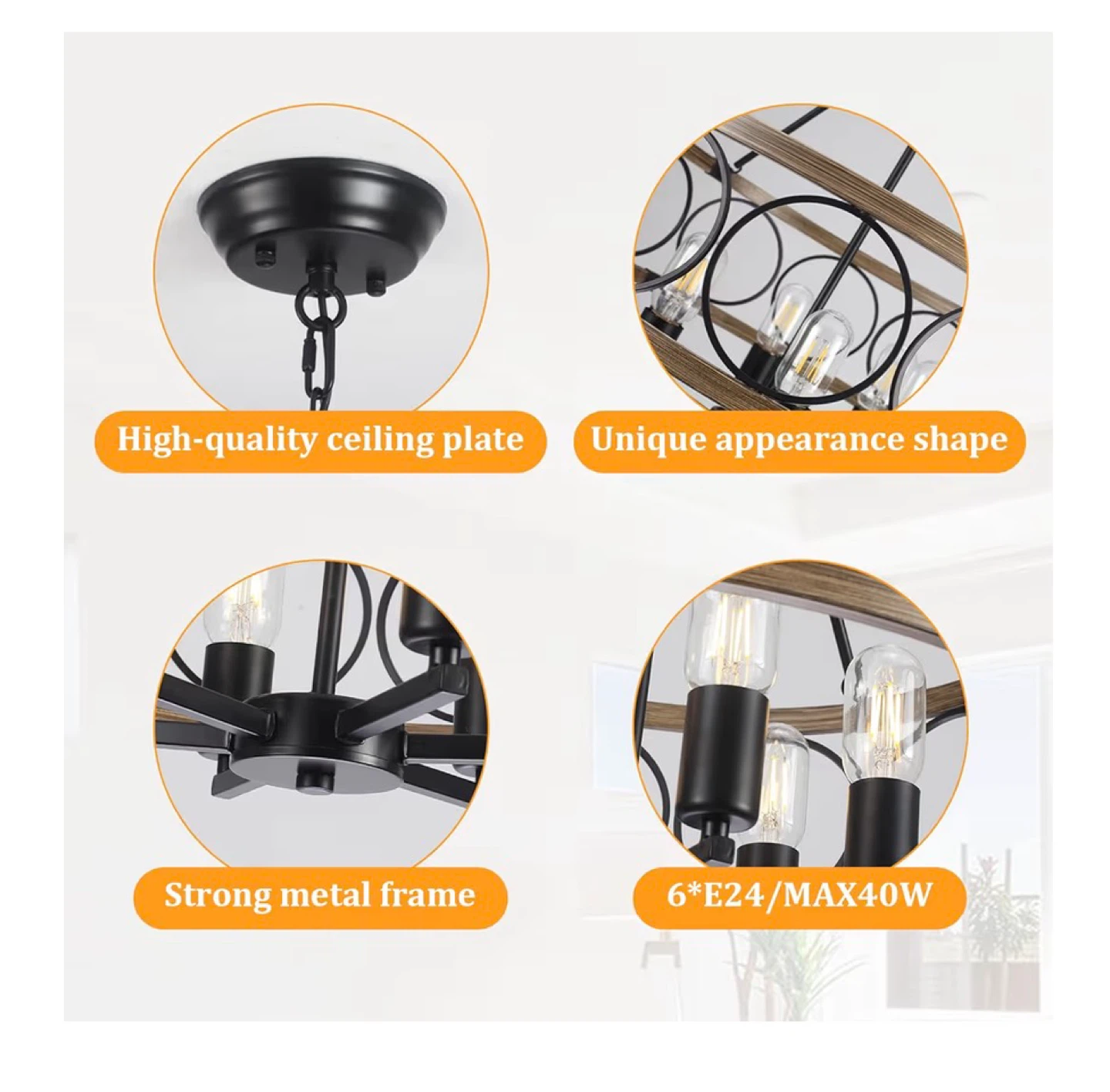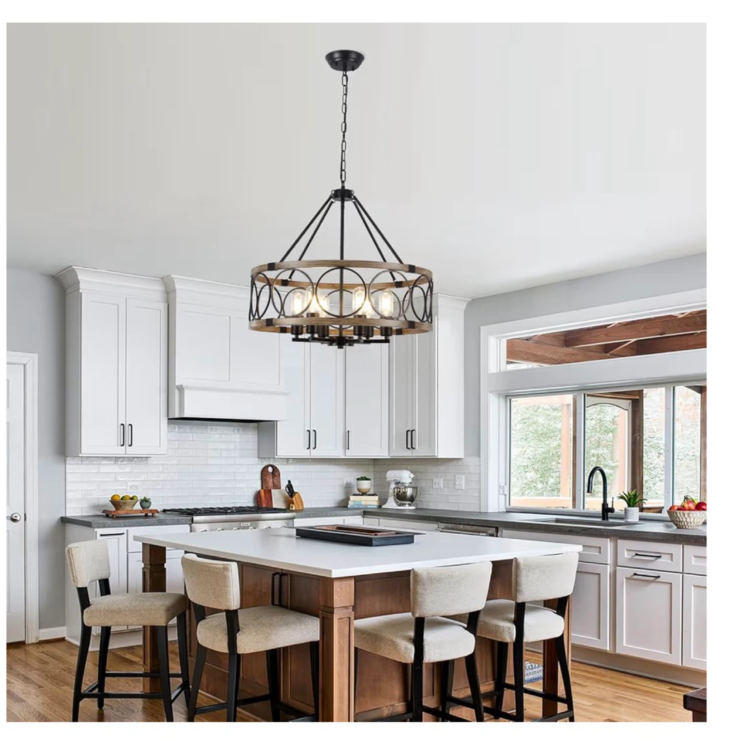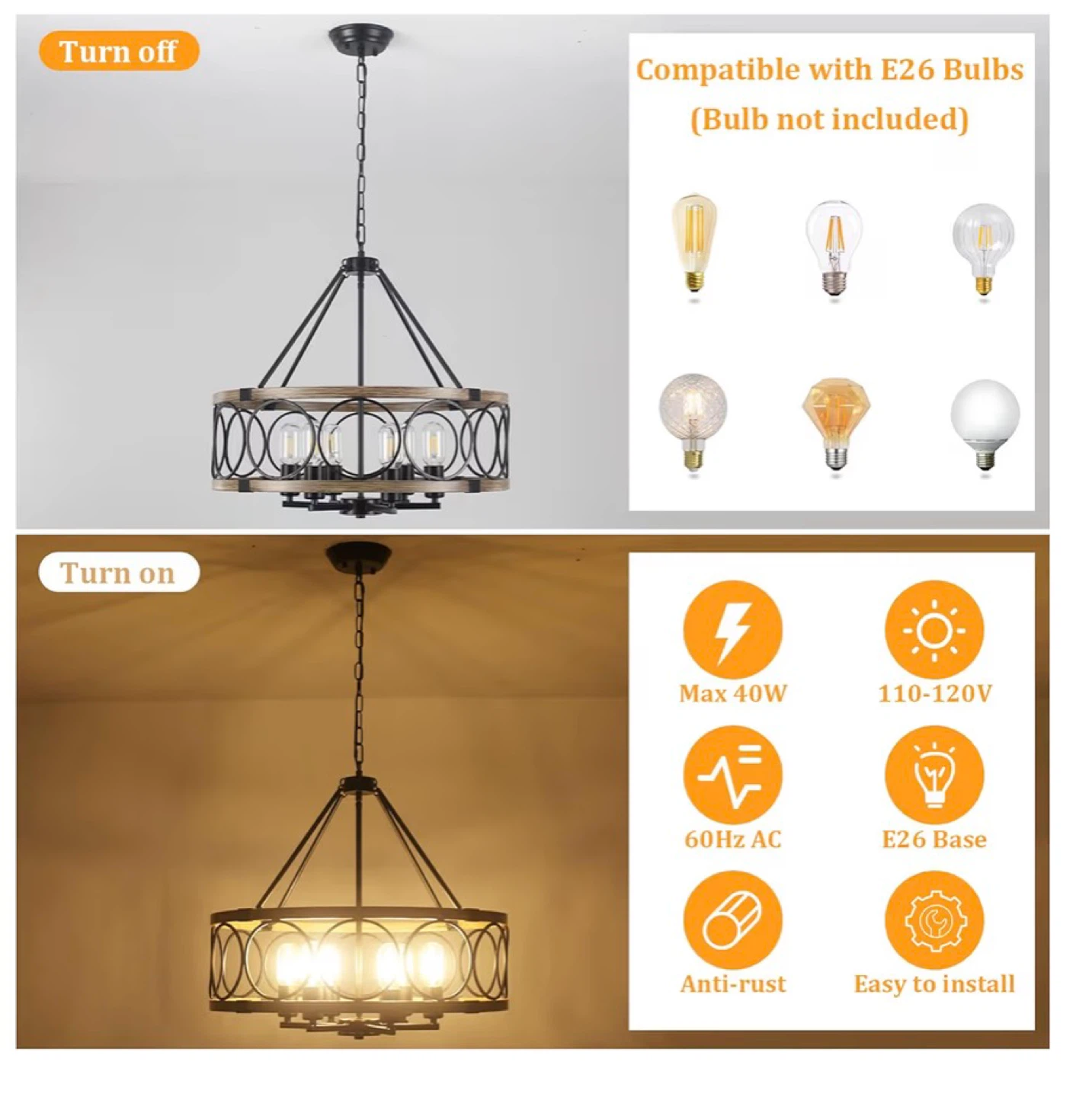 This farmhouse chandelier features a rustic wood grain finish with black metal accents and circular details. It's a 6-light fixture compatible with E26 bulbs and offers adjustable height for various ceiling types. The diameter is 21.65 inches and the fixture height is 7.08 inches.