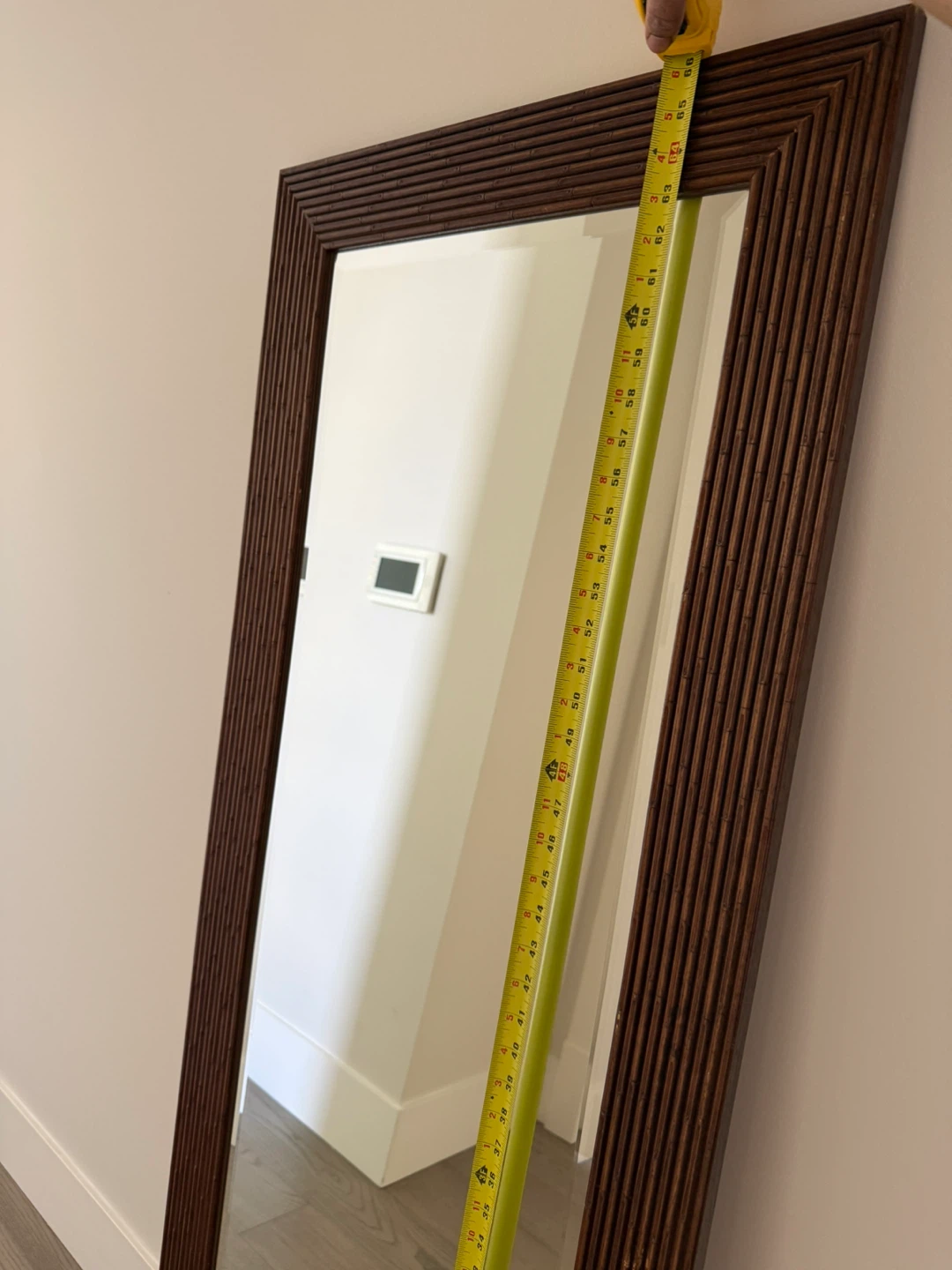 A large wooden mirror with a brown ribbed frame. It measures approximately 24 inches wide and 60 inches tall. This mirror would look great in an entryway or bedroom.