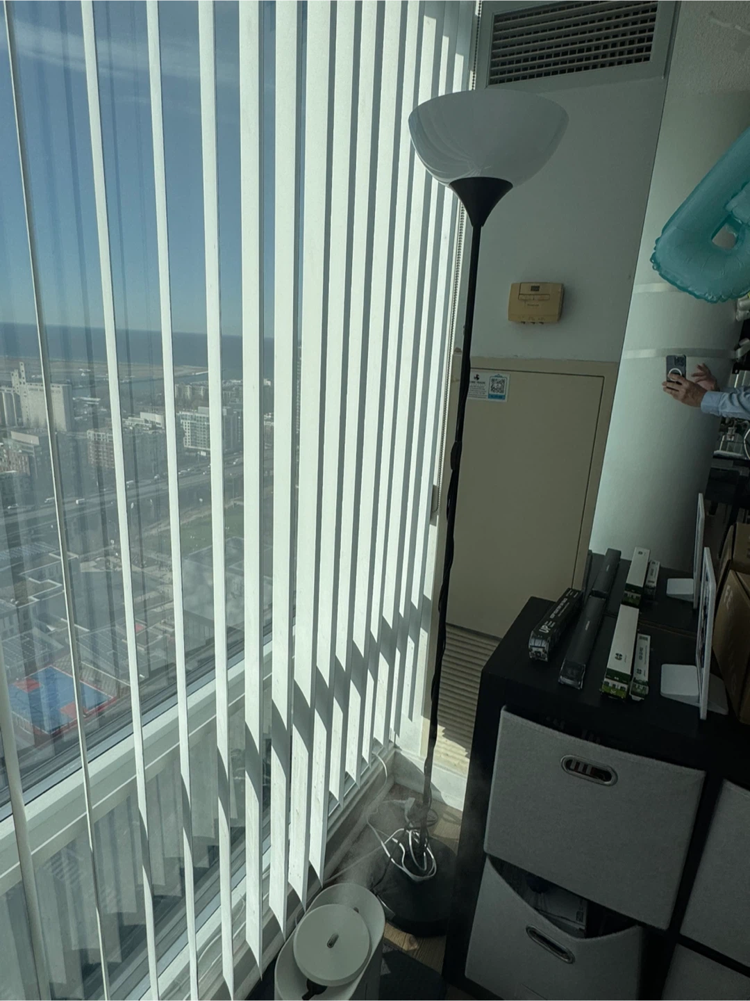 This is a black floor lamp with a white shade. It's a simple, tall lamp that provides ambient lighting. It's great for adding light to a corner of a room.
