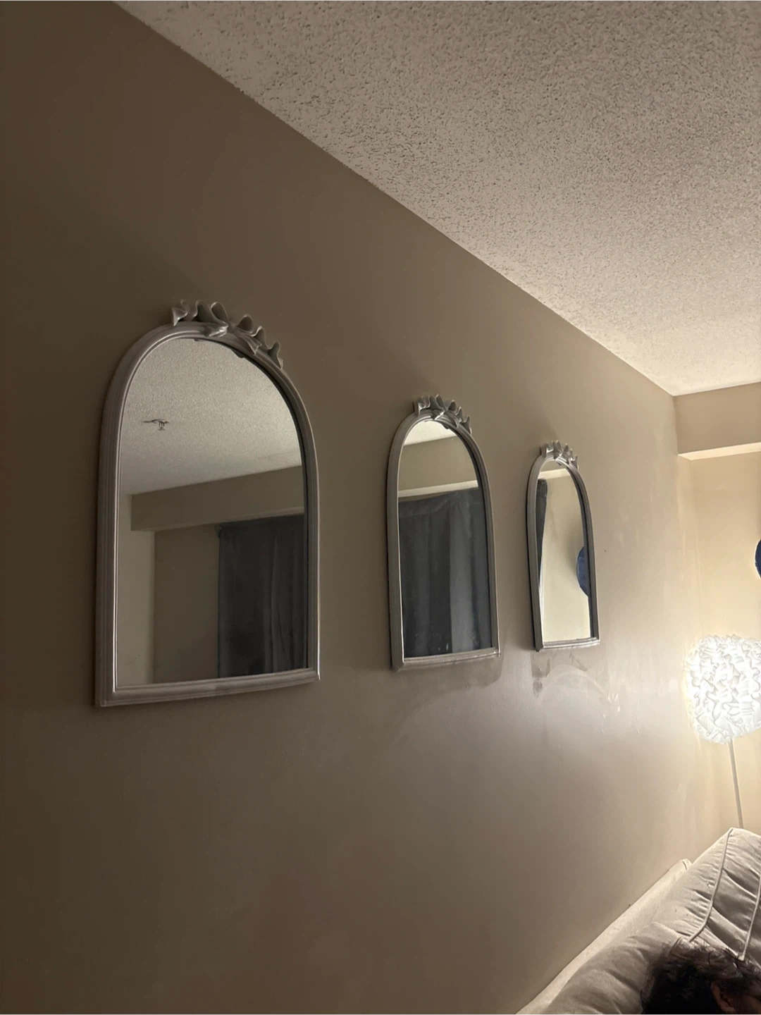 Three decorative arch mirrors with ornate silver frames. These mirrors are a lovely way to add depth and style to any room. Their unique shape makes them a charming accent piece!
