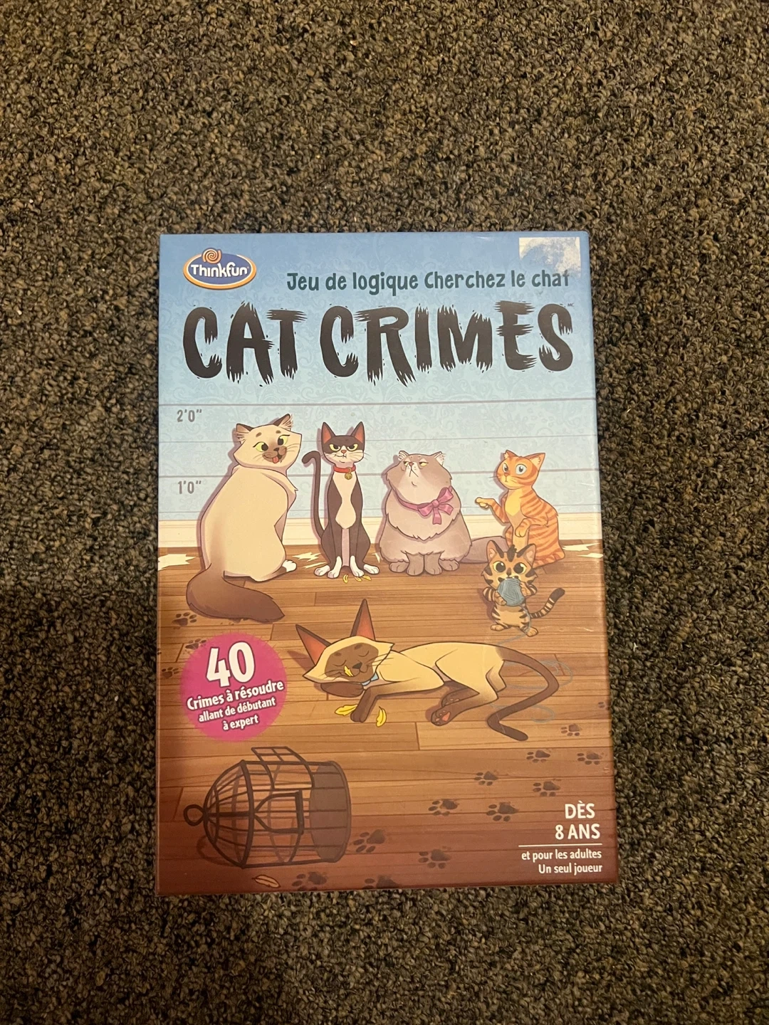 This is the Cat Crimes logic game from ThinkFun. It includes 40 crimes to solve, suitable for beginners to experts. Recommended for ages 8 and up.