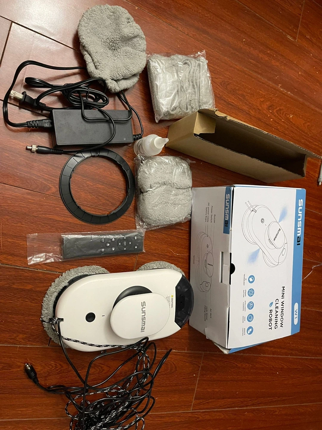 Selling a SUNSMAI window cleaning robot! It comes with the original box and includes a remote control, cleaning pads, and safety rope. This robot features automatic spray, embedded UPS, and anti-loss control. It's suitable for glass, windows, and tables, and can handle glass thicknesses exceeding 0.23"/6mm