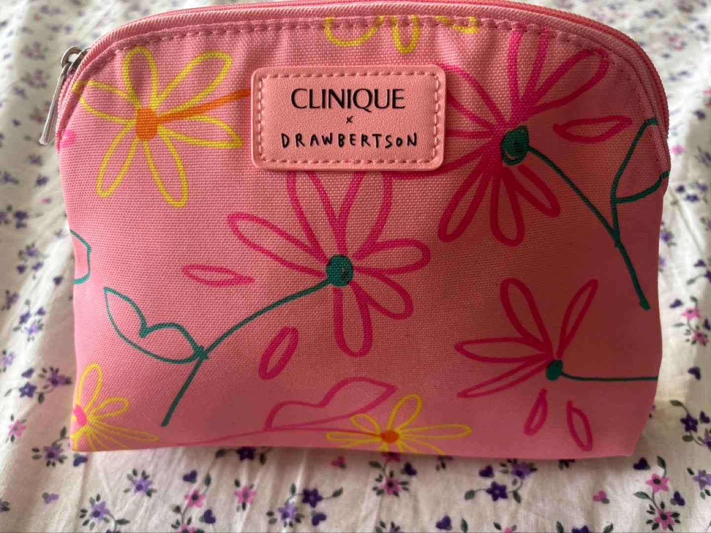 Clinique makeup bag featuring a floral design. Includes various Clinique skincare and makeup items. Perfect for travel or everyday use.