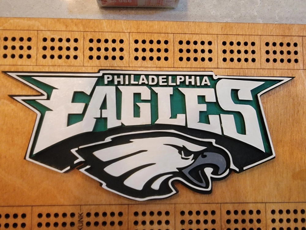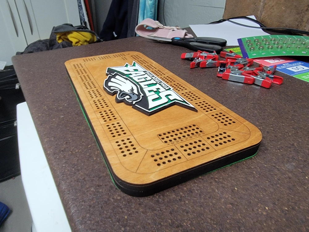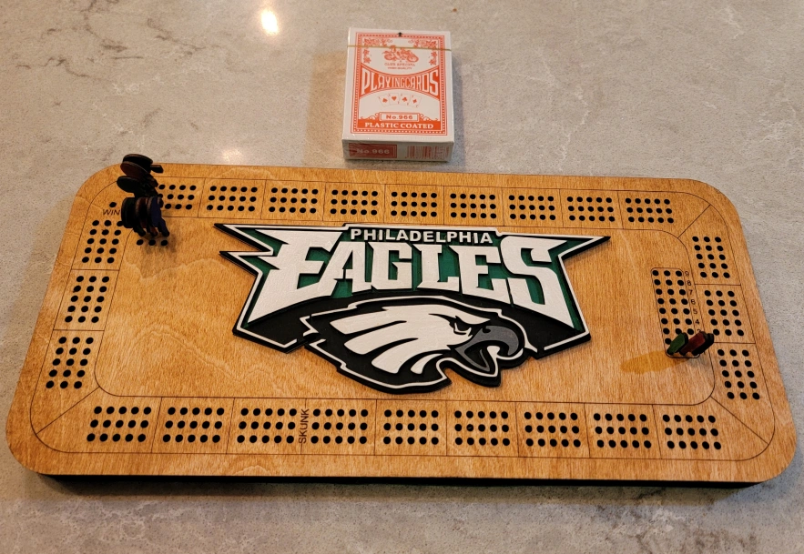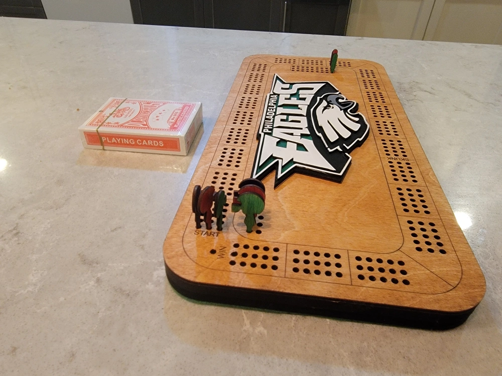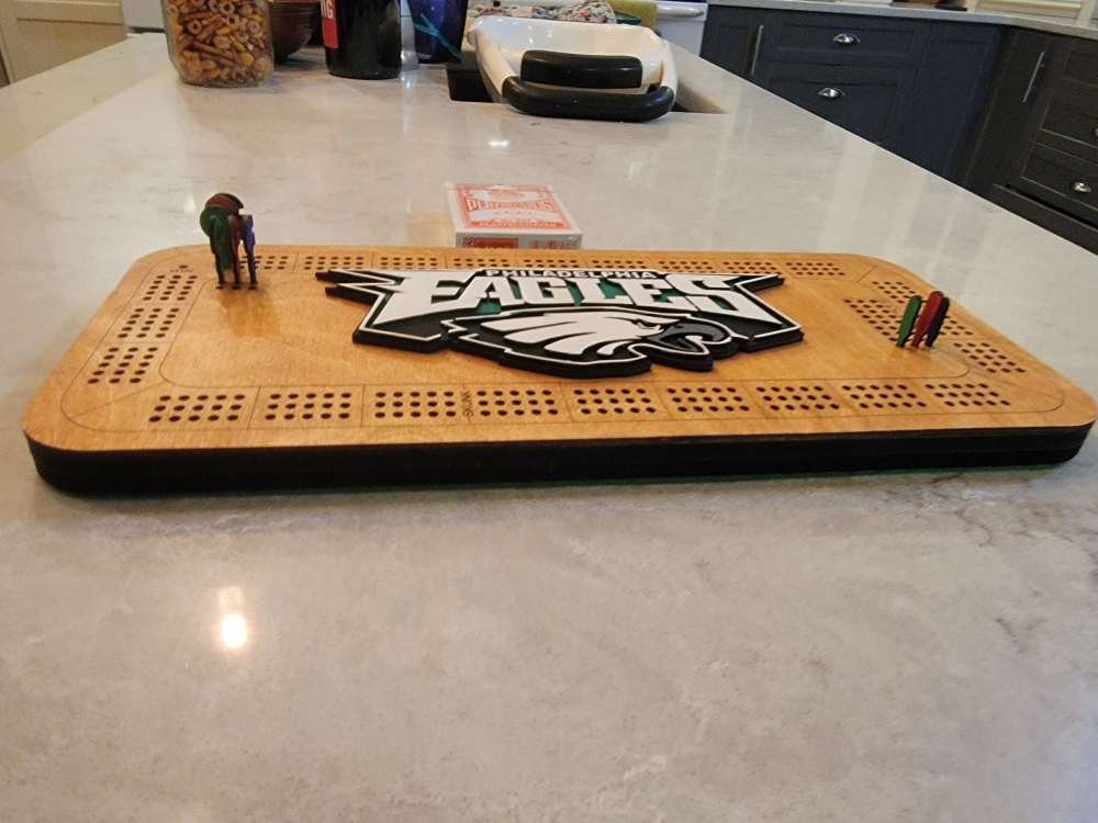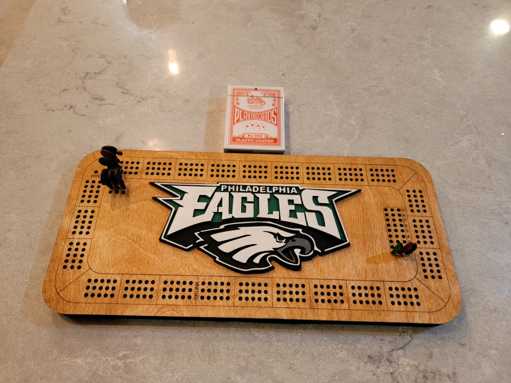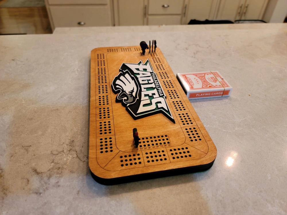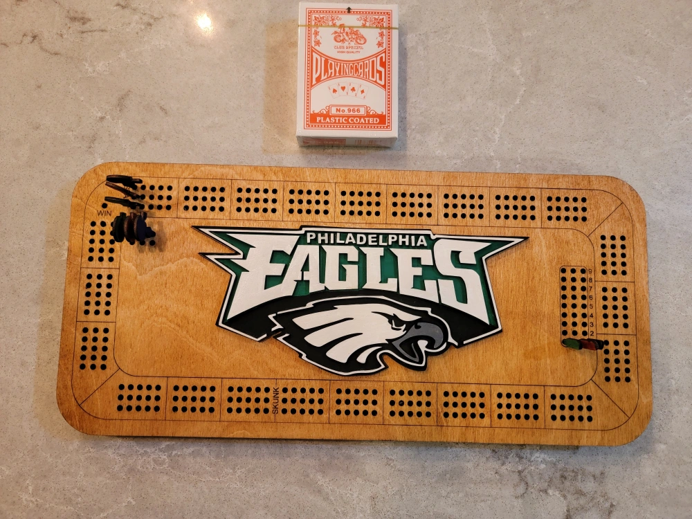 Custom-made cribbage board. This one features Phildaelphia Eagkes logo. Can custom do most sports teams including hockey etc. Includes game pieces. Cards are shown for scale. Laser Cut Wooden construction.
