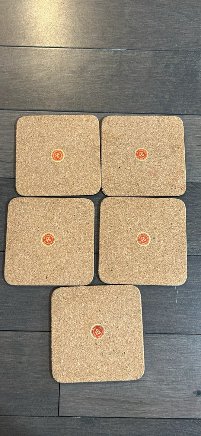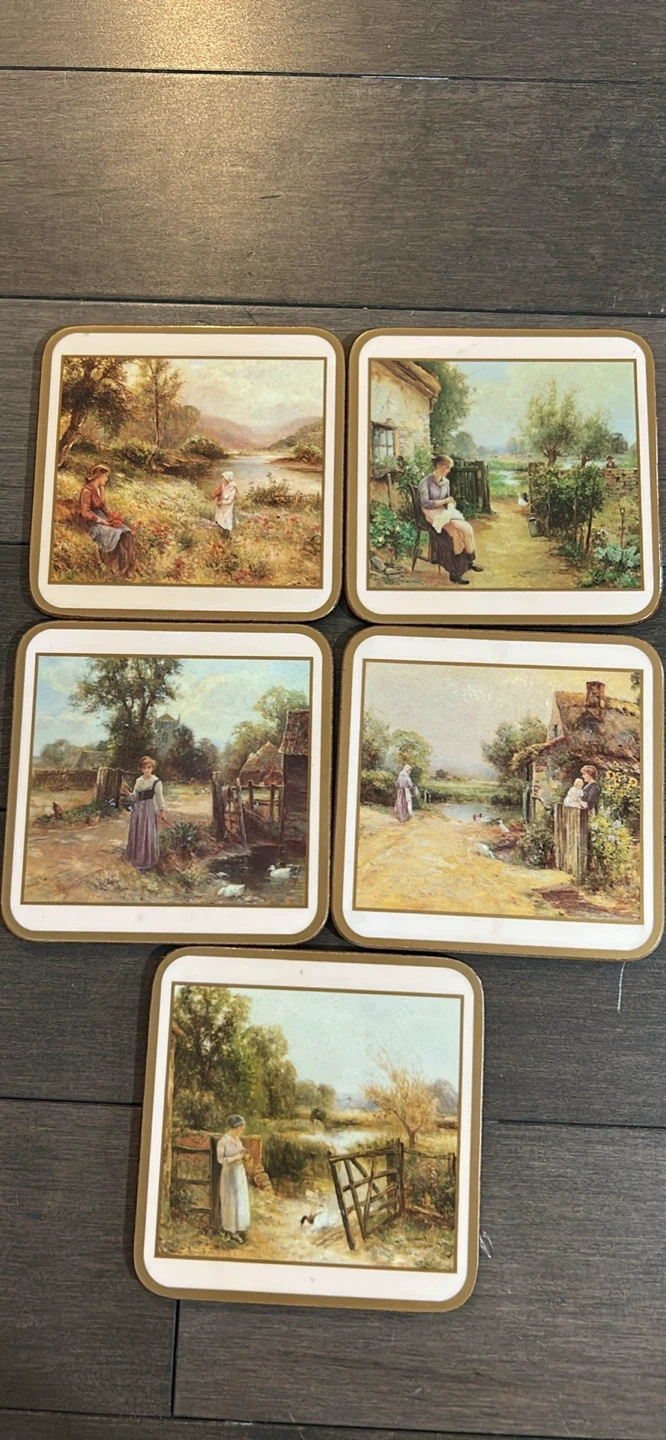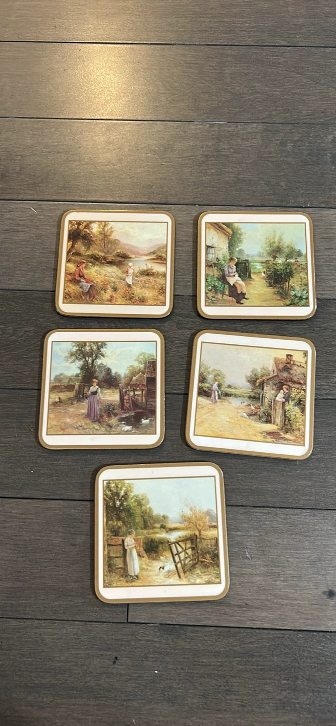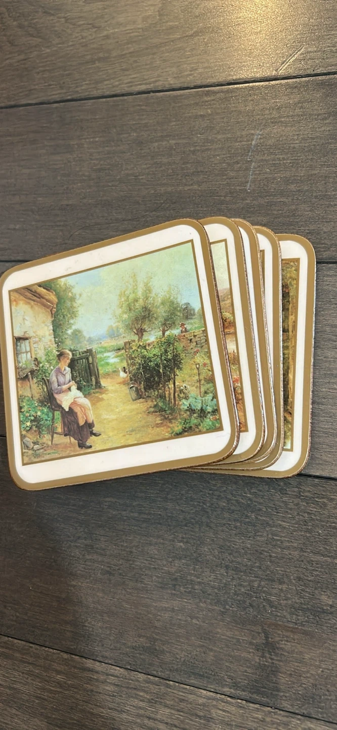 Lovely set of five cork-backed coasters, each featuring a different pastoral scene. Made in England, they're perfect for protecting your surfaces with a touch of vintage charm. Cork backing provides good grip and prevents scratches.