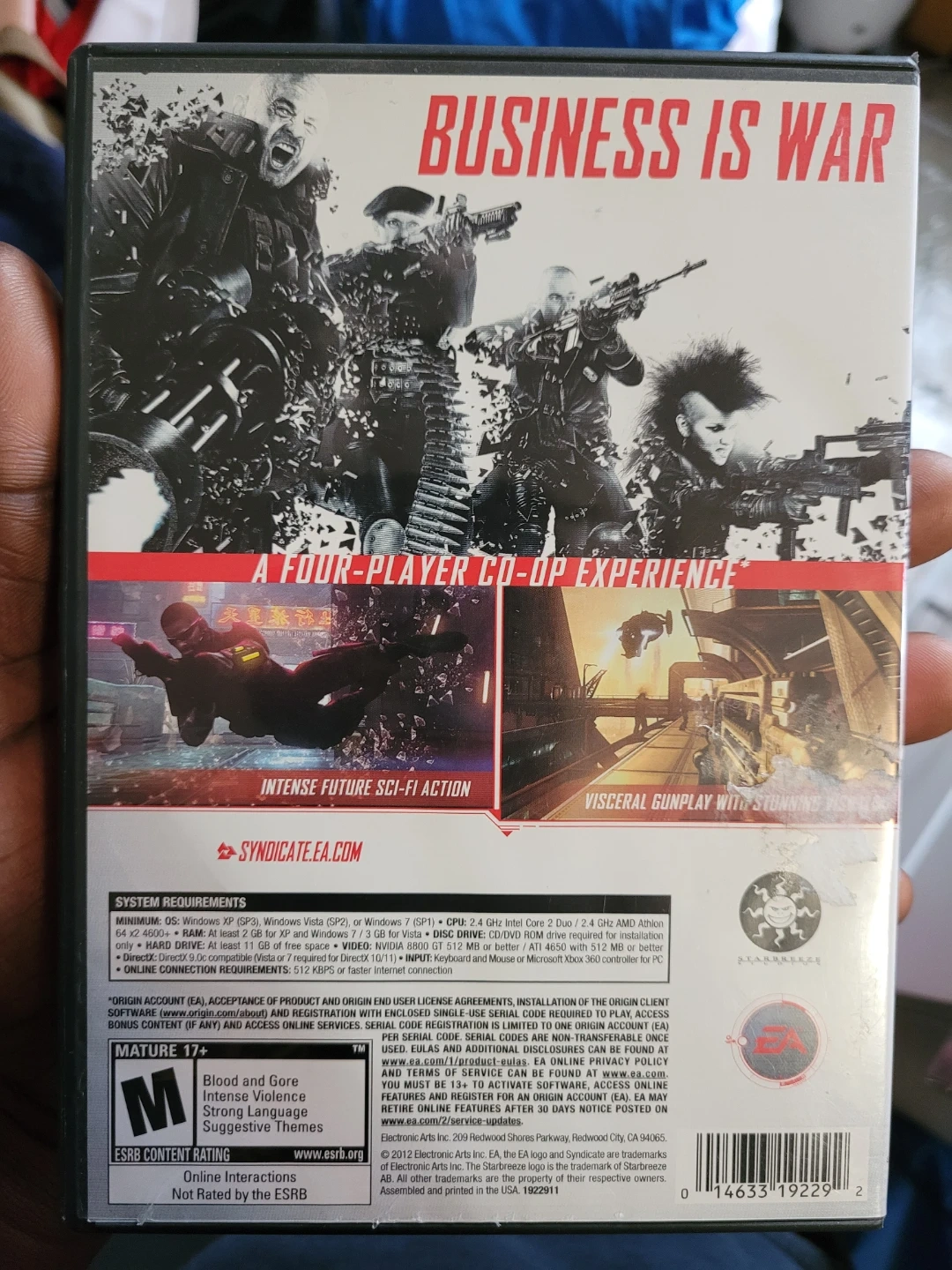 Syndicate for PC. This is a first-person shooter game with a four-player co-op experience. It features intense future sci-fi action and visceral gunplay. Requires internet connection for product activation.